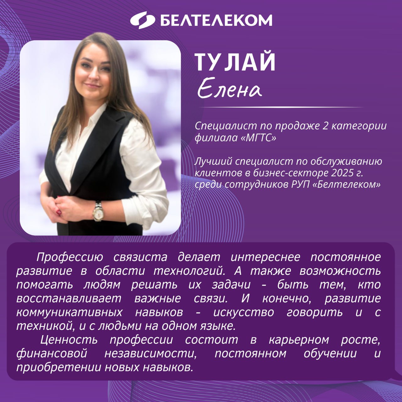 ➡️ Сегодня в рубрике #КарьеравБелтелеком - Елена Тулай, победитель конкурса профмастерства в номинации «Лучший специалист по обслуживанию клиентов в бизнес-секторе»!