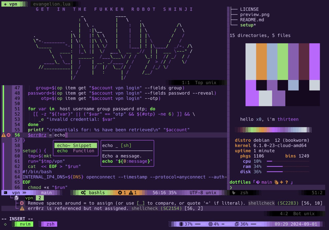 Тема раскрашивает ваш редактор в те самые фиолетово-зеленые тона Евы-01, и выглядит это на удивление стильно и читабельно.
