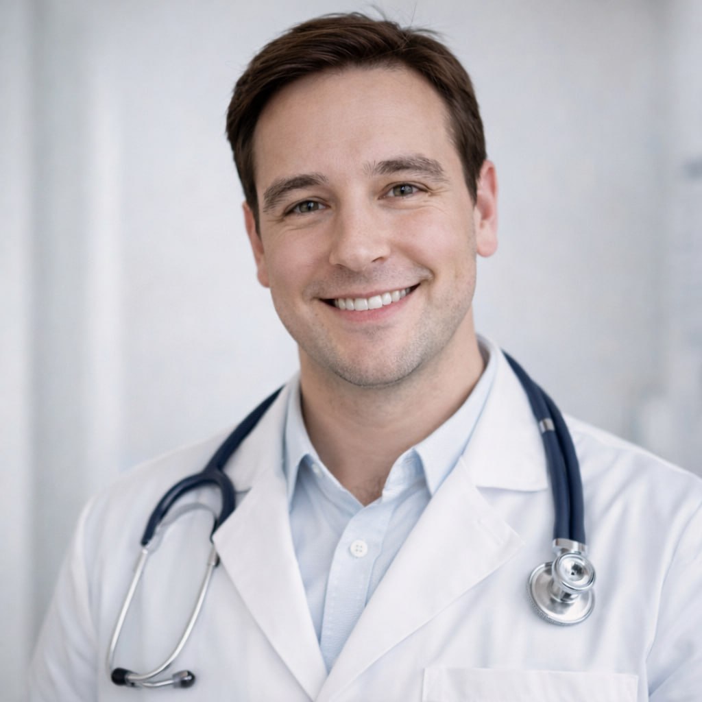 Создай профессиональный портрет врача для аватарки в социальных сетях, не изменяя внешность человека на исходной фотографии. Сохрани черты лица, возраст, форму лица и выражение.