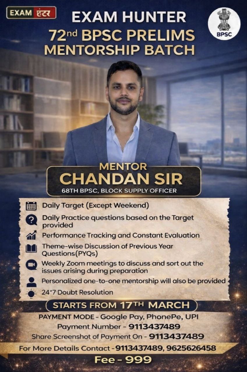 72nd BPSC Prelims Mentorship Batch.. 17th March se start hoga.. Next 4 months me aapko har tarike se Prelims ke liye taiyar karaya jayega.. Prelims ab aap sab dekh hi rahe honge ki kitna diverse ho gaya hai.. Aapko apne preparation ka range badhana hoga taki har situation ke liye aap taiyar rahe.. Isme aapko sab kuchh bataya jayega.. Jo interested hain wo ek week ka Demo session bhi le sakte hain
