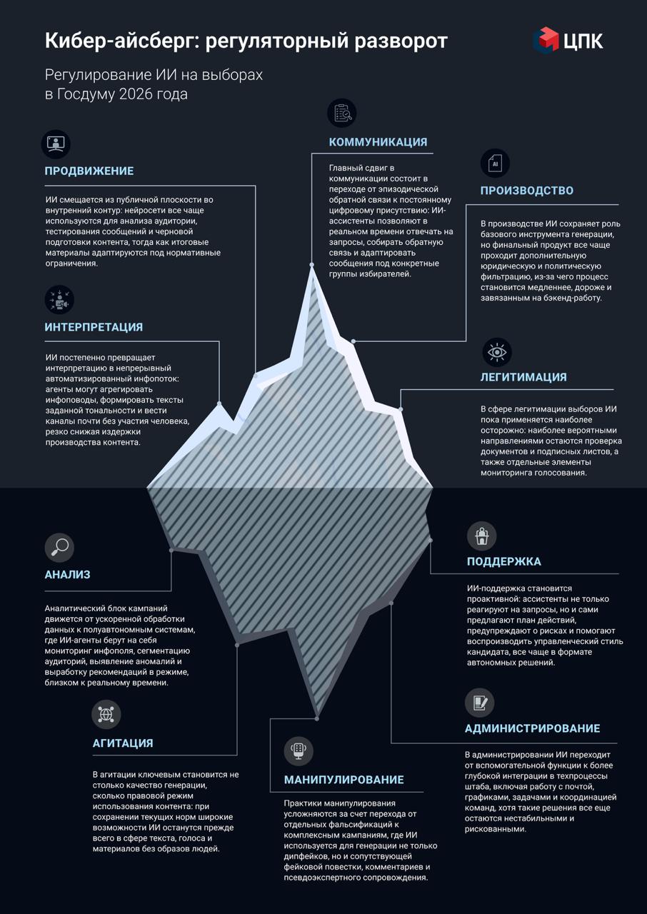3. Слабое нормативное регулирование использования нейросетей в рамках электоральных кампаний оставляет широкое пространство для маневра. Имеющиеся поправки регламентируют лишь использование образов реальных и вымышленных людей в агитматериалах, сгенерированных с применением «информационных технологий» (не только нейросетей). То есть, в случае отсутствия дополнительных решений на предстоящей кампании-2026, не будет специальных норм, регулирующих практики использования ИИ.