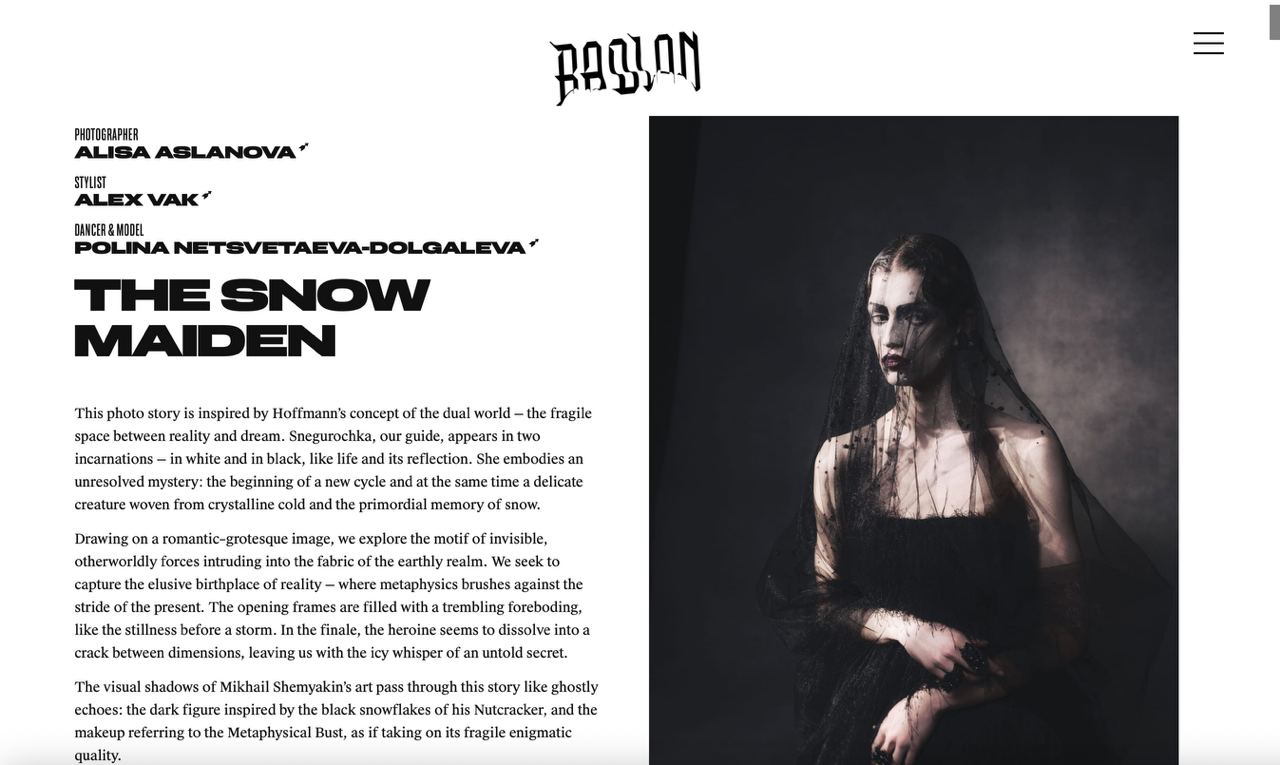 Символично, что публикация вышла в 250-летие Эрнста Теодора Амадея Гофмана, ведь эта фотоистория вдохновлена гофмановской концепцией двоемирия — зыбкого пространства между явью и грезой. Снегурочка — наша проводница — предстает в двух воплощениях — в белом и черном, как жизнь и ее отражение.