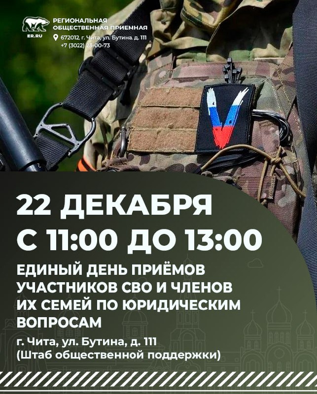 📅 22 декабря с 11:00 до 13:00 в Штабе общественной поддержки «Единой России» состоится Единый день приёмов участников СВО и членов их семей по юридическим вопросам. 👨‍👩‍👦 В этот день бойцы и их близкие смогут оставить обращение, задать интересующий вопрос или получить консультацию. 🤝 Приёмы будут проводиться с привлечением депутатов всех уровней, а также представителей организаций-партнёров, профильных ведомств и органов исполнительной власти. 🆓 Все консультации бесплатны! 📞 Записаться на приём можно по телефону 23-00-73. 📍 Адрес: г. Чита, ул. Бутина, д. 111, кабинет 12 (Региональная общественная приёмная Д. А. Медведева). #ЮридическаяМомощь #СВОихНеБросаем #Штаб75 #ЕР75 #РОП