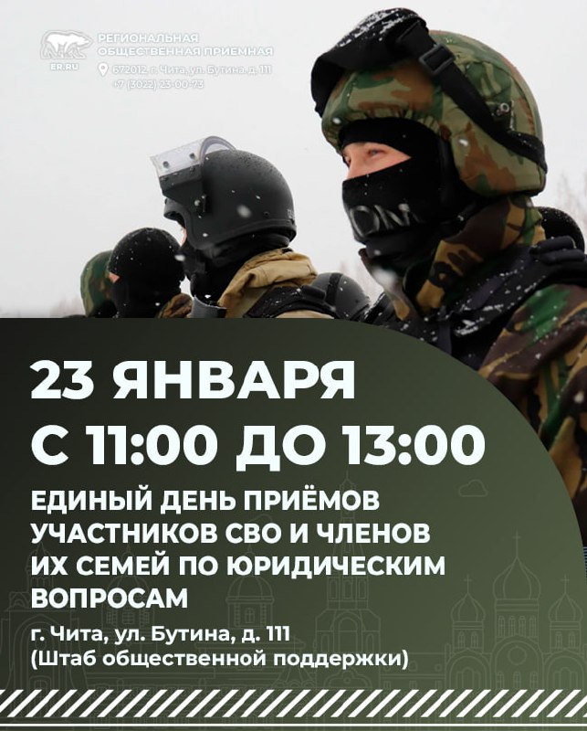 🗓 23 января с 11:00 до 13:00 в Штабе общественной поддержки «Единой России» состоится Единый день приёмов участников СВО и членов их семей по юридическим вопросам. 📣 В этот день бойцы и их близкие смогут оставить обращение, задать интересующий вопрос или получить консультацию. 🤝 Приёмы будут проводиться с привлечением депутатов всех уровней, а также представителей организаций-партнёров, профильных ведомств и органов исполнительной власти. ✅ Все консультации бесплатны! ☎️ Записаться на приём можно по телефону 23-00-73. 📍 Адрес: г. Чита, ул. Бутина, д. 111, кабинет 12 (Региональная общественная приёмная Д. А. Медведева). #ЕР75 #Штаб75 #РОП #СВОихНеБросаем #юридическаяпомощь