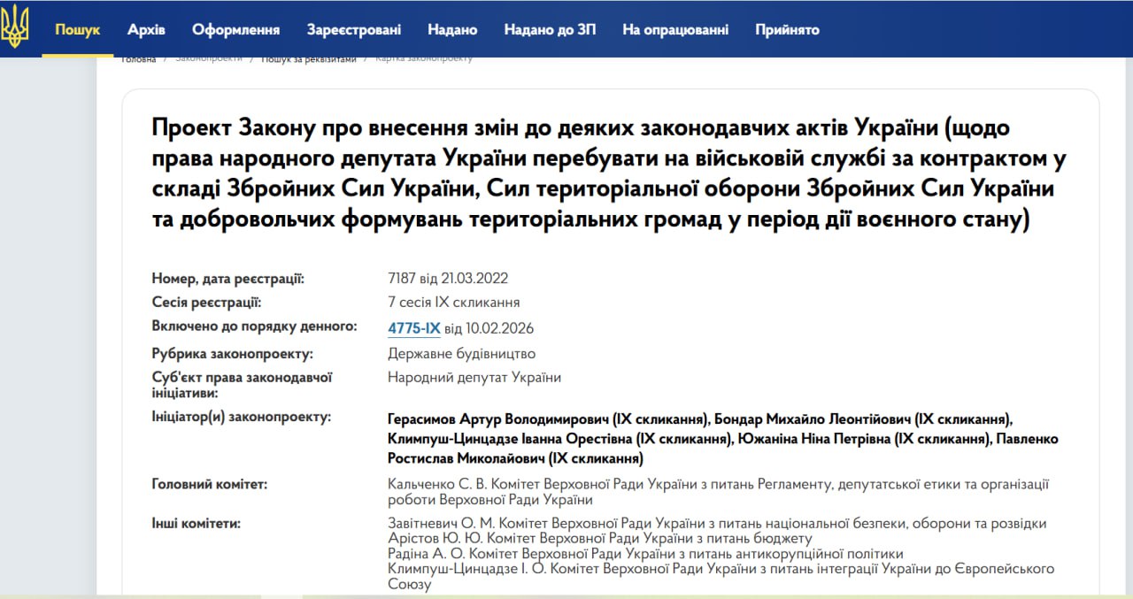 І ще 21 березня 2022 року, коли рашисти перебували під Києвом, група нардепів з Європейської Солідарності зареєстрували Проект Закону №7187 про внесення змін до деяких законодавчих актів України (щодо права народного депутата України перебувати на військовій службі за контрактом у складі Збройних Сил України, Сил територіальної оборони Збройних Сил України та добровольчих формувань територіальних громад у період дії воєнного стану). І вже 24 березня, згідно сайту Ради, його було прийнято за основу.