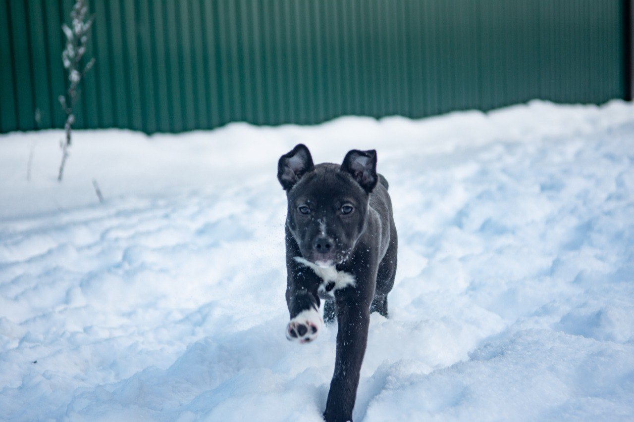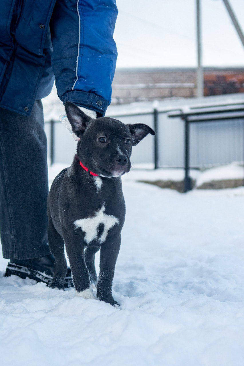 Пас — 4-месячный щенок от стаффорда и лайки. Темно-стального окраса, с белым пятном на груди в виде двух обнимающихся голубей — щенка символично назвали Пасом (от Pacific, «мирный»), имя отражает его добрый и мирный характер.