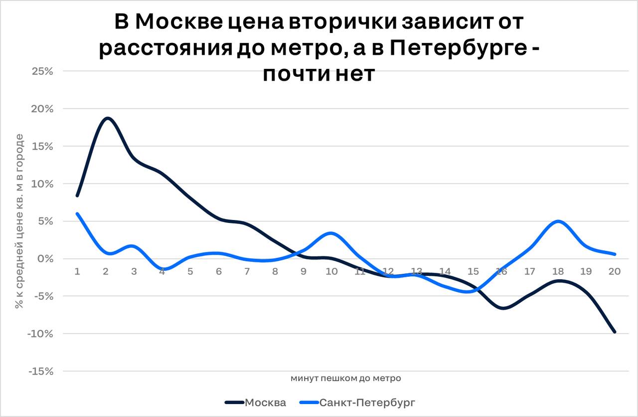В Петербурге, где темпы развития транспорта были кратно ниже, соотношение “чем ближе - тем дороже” больше не работает. Многие недавние новостройки (на которые приходится уже до трети всей вторички) размещены далеко от станций, что не помешало там выставлять достаточно высокие цены.