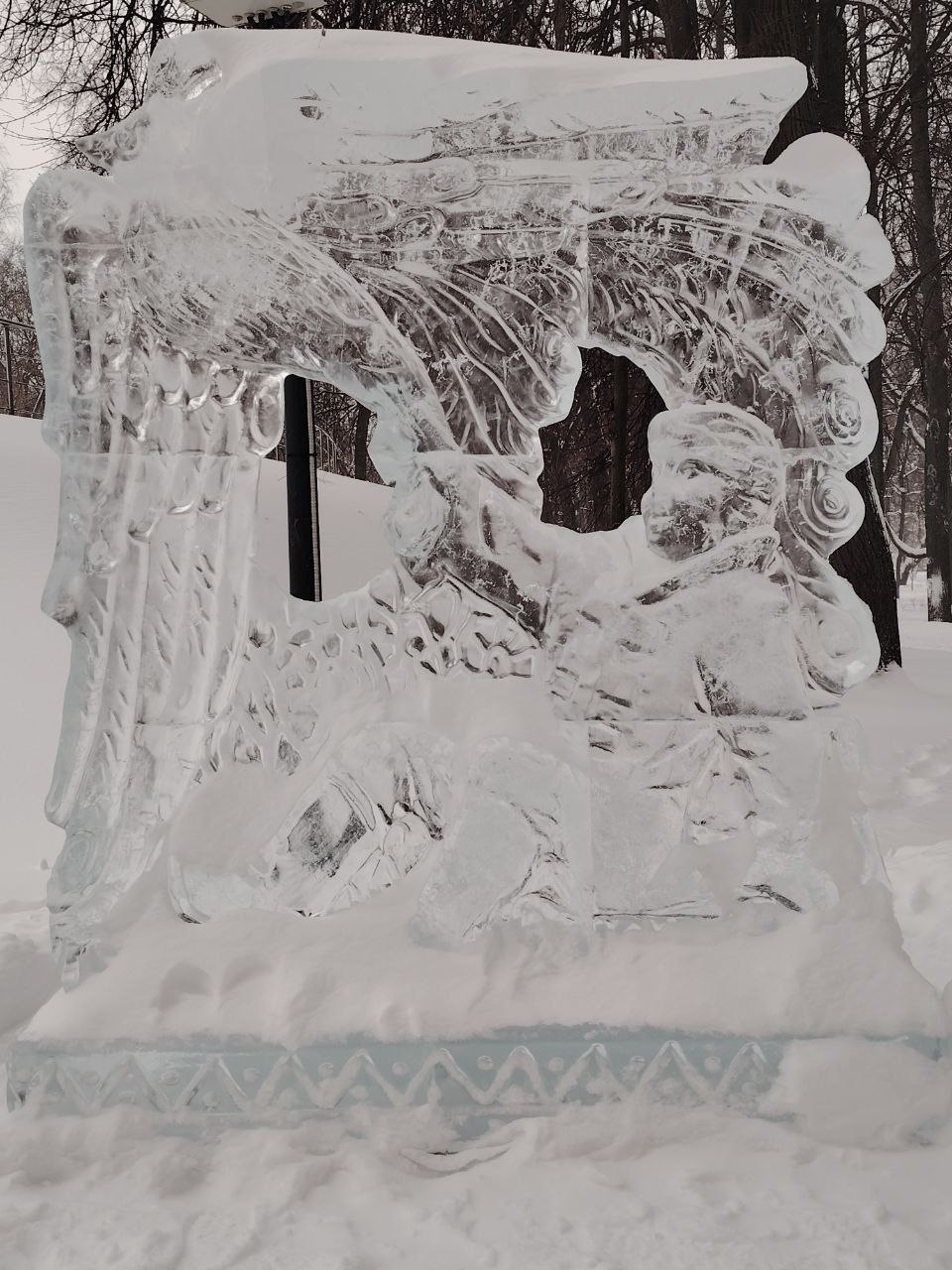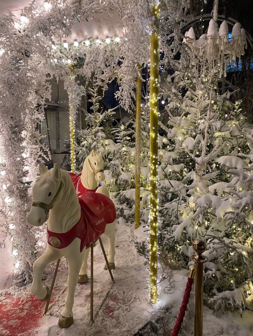 Вечером Манежная площадь превращается в одну из самых атмосферных точек центра: на фасаде Центрального Манежа загораются праздничные световые проекции. Здание оживает за счёт света, графики и зимних сюжетов.