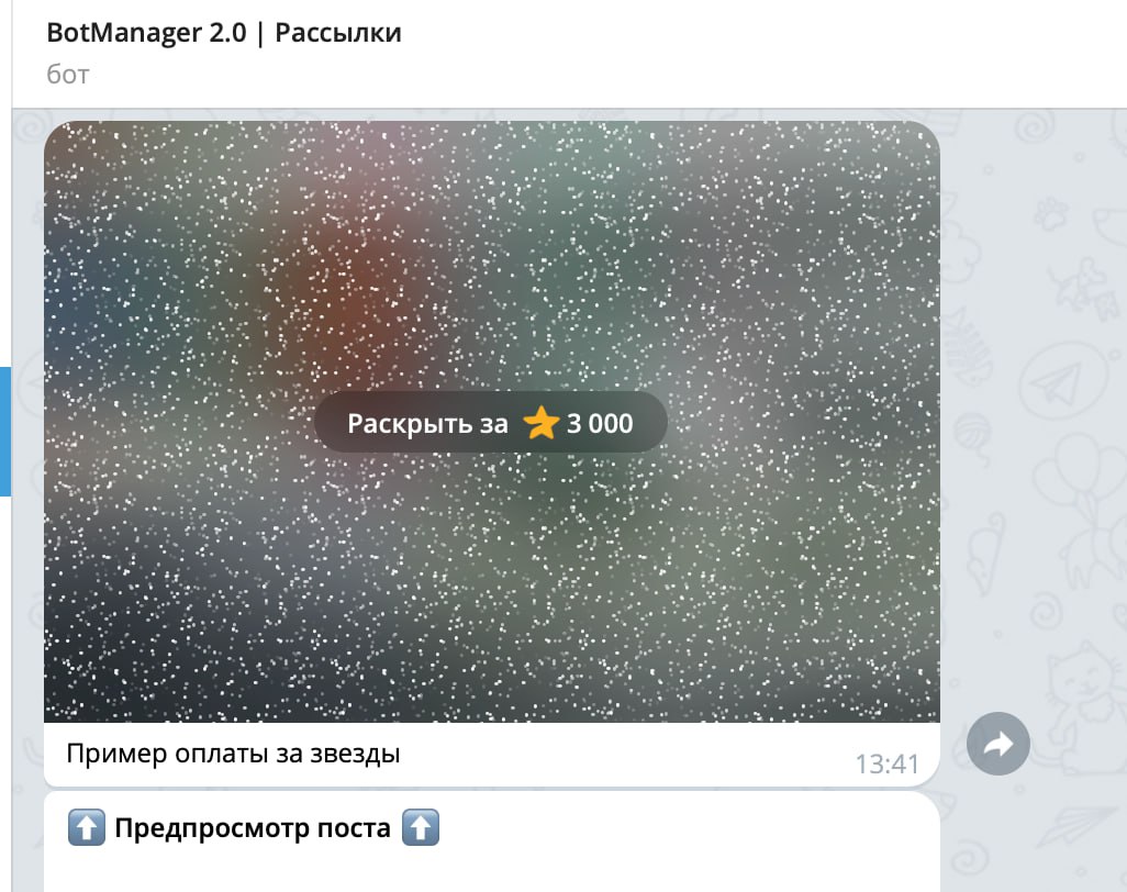 Стоимость — 0.1 Telegram Stars за одно сообщение. Звезды списываются с баланса вашего бота.