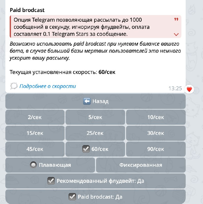 Paid Broadcast можно использовать даже при нулевом балансе Stars у бота. Это может ускорить рассылку, если в базе много мертвых пользователей. Опция находится в разделе "Скорость"