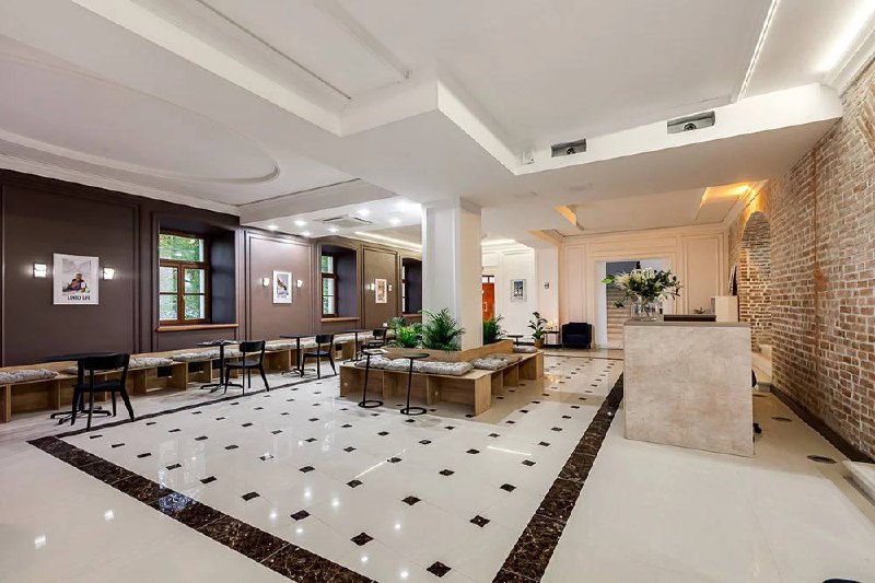 — Холл на первом этаже: лобби с посадочными местами и мини библиотекой.