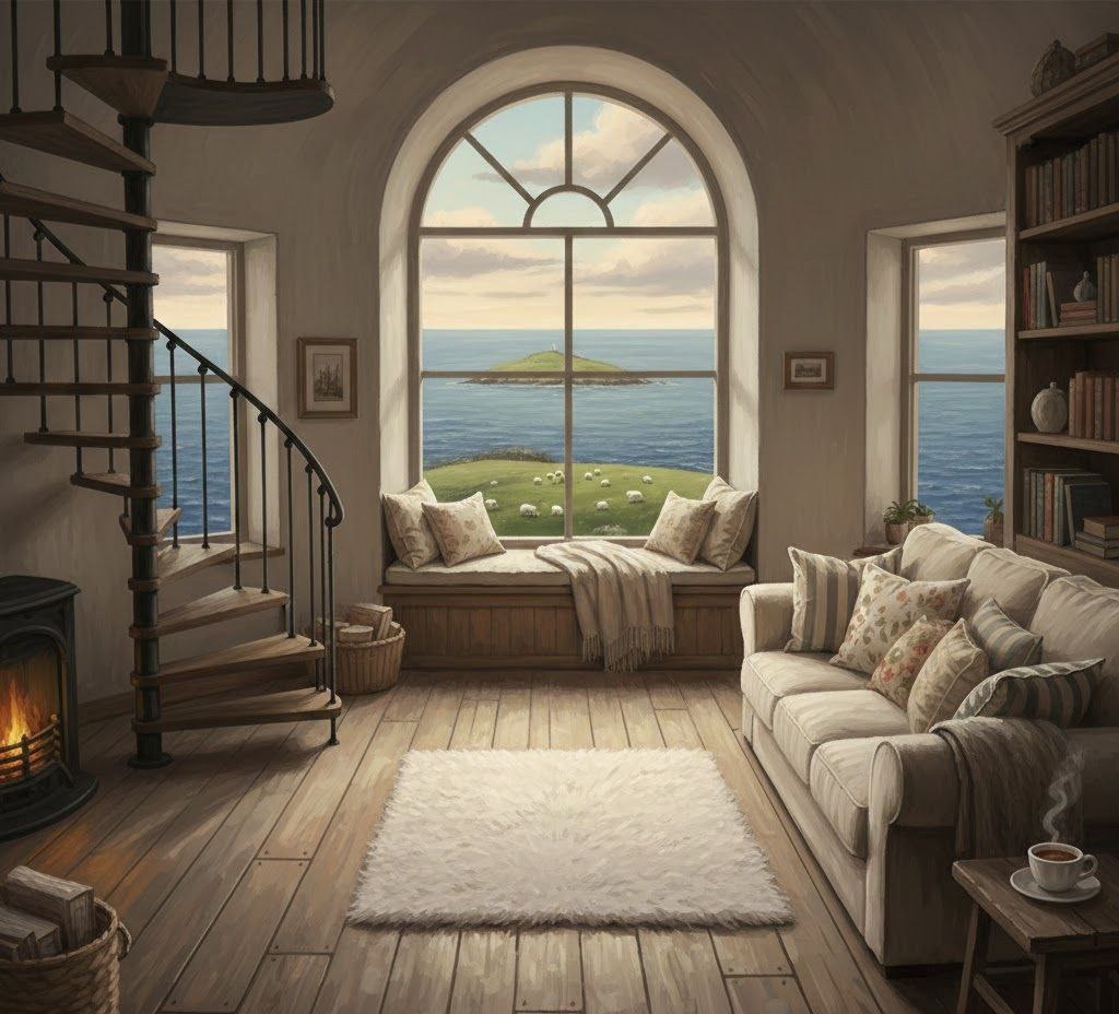 На таких же деревянных половицах, как и в помещении ниже, перед диваном с кучей подушечек лежит пушистый белый ковер. Окно гораздо больше, чем внизу, встроенная в стену скамья для сидения зовет устроиться удобнее. Боже, я могла бы сидеть там часами и глядеть из окна.
