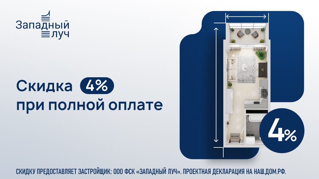 Скидка 4% при полной оплате! Представьте: вы выходите из дома — и уже в центре Челябинска. «Западный луч» — готовый для жизни дом с уютным двором, где есть место и для детского смеха, и для тихого вечера. Здесь легко переключаться с городского ритма на свой, далеко не уезжая. Планировки продуманы так, чтобы квартира подстраивалась под вас, а не наоборот: можно организовать рабочий угол, зону отдыха и хранения так, как удобно именно вам. Дом уже сдан, а ключи передаются в день сделки — остаётся решить, какой интерьер вы хотите видеть вокруг себя. При полной оплате действует скидка 4% — приятный бонус к переезду в центр. Оставьте заявку, чтобы подобрать квартиру в «Западном луче» и узнать детали акции. Узнать больше Проектная декларация на сайте https://наш.дом.рф/. Застройщик: ООО СЗ ФСК ЗАПАДНЫЙ ЛУЧ. Финансовые услуги оказывает: ПАО "Промсвязьбанк", ПАО "БАНК УРАЛСИБ", ПАО "Совкомбанк". #реклама жизньвлуче.рф О рекламодателе