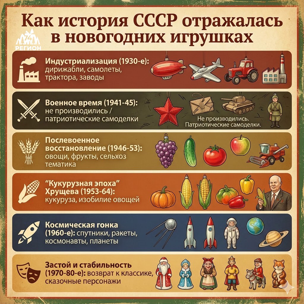 🎄 Советские новогодние игрушки — магия прошлого на ёлке Помните эти хрупкие стеклянные шедевры — зайчиков, космонавтов, шишки, сосульки и яркие шары с облупившейся краской? Каждая игрушка — как маленькая история времени, когда праздник пах мандаринами, хвоей и ожиданием чуда. Такие игрушки делались вручную: стеклодувы выдували форму, а художники расписывали каждую деталь. Поэтому двух одинаковых игрушек не существовало. Сегодня эти украшения стали настоящими раритетами и предметом коллекционирования. А кто-то достаёт их просто ради того, чтобы вернуть атмосферу детства — когда под ёлкой стояли хлопушки, а телевизор показывал «Иронию судьбы». ✨ А у вас сохранились советские игрушки? Какие из них вы считаете самыми «тёплыми» и родными? 🌄 Расскажи свою новость всему региону. Напиши нам @nashregion74bot