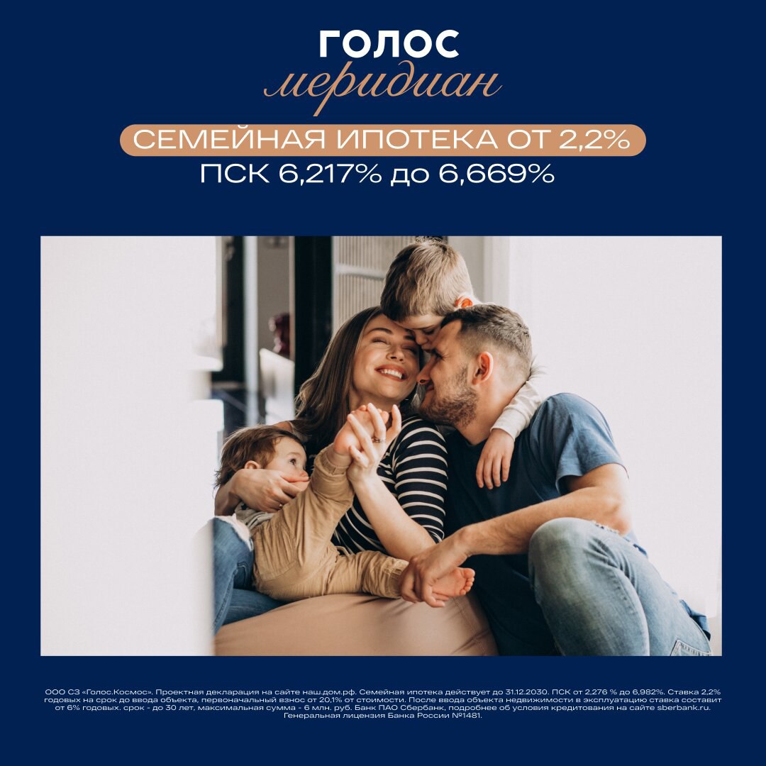 Семейная ипотека ПСК2,276-6,982% ставка 2,2% Новый проект девелопера «Группа Голос» в Челябинске для тех, кто ценит высокое качество жизни. В жилом квартале «Голос Меридиан» есть: — квартиры с удобными планировками, — гардеробные и мастер-спальни, — высокие потолки и wow-окна с шумоизоляцией, — изысканное центральное лобби, — подземный паркинг и видеонаблюдение. Удобное расположение позволяет добраться до центра за 5 минут, в шаговой доступности ТРК «Горки»! Сейчас действует специальное предложение по семейной ипотеке ПСК 6,217-6,669% со сниженной ставкой 2,2%. Оставьте заявку на сайте, чтобы узнать подробности и получить подборку подходящих квартир. Узнать цену Изучите все условия кредита (займа) на сайте в соответствующем разделе. Оценивайте свои финансовые возможности и риски. Проектная декларация на сайте https://наш.дом.рф/. Застройщик: ООО СПЕЦИАЛИЗИРОВАННЫЙ ЗАСТРОЙЩИК "ГОЛОС.КОСМОС". Финансовые услуги оказывает: АО "Банк ДОМ.РФ". #реклама mrqz.me О рекламодателе