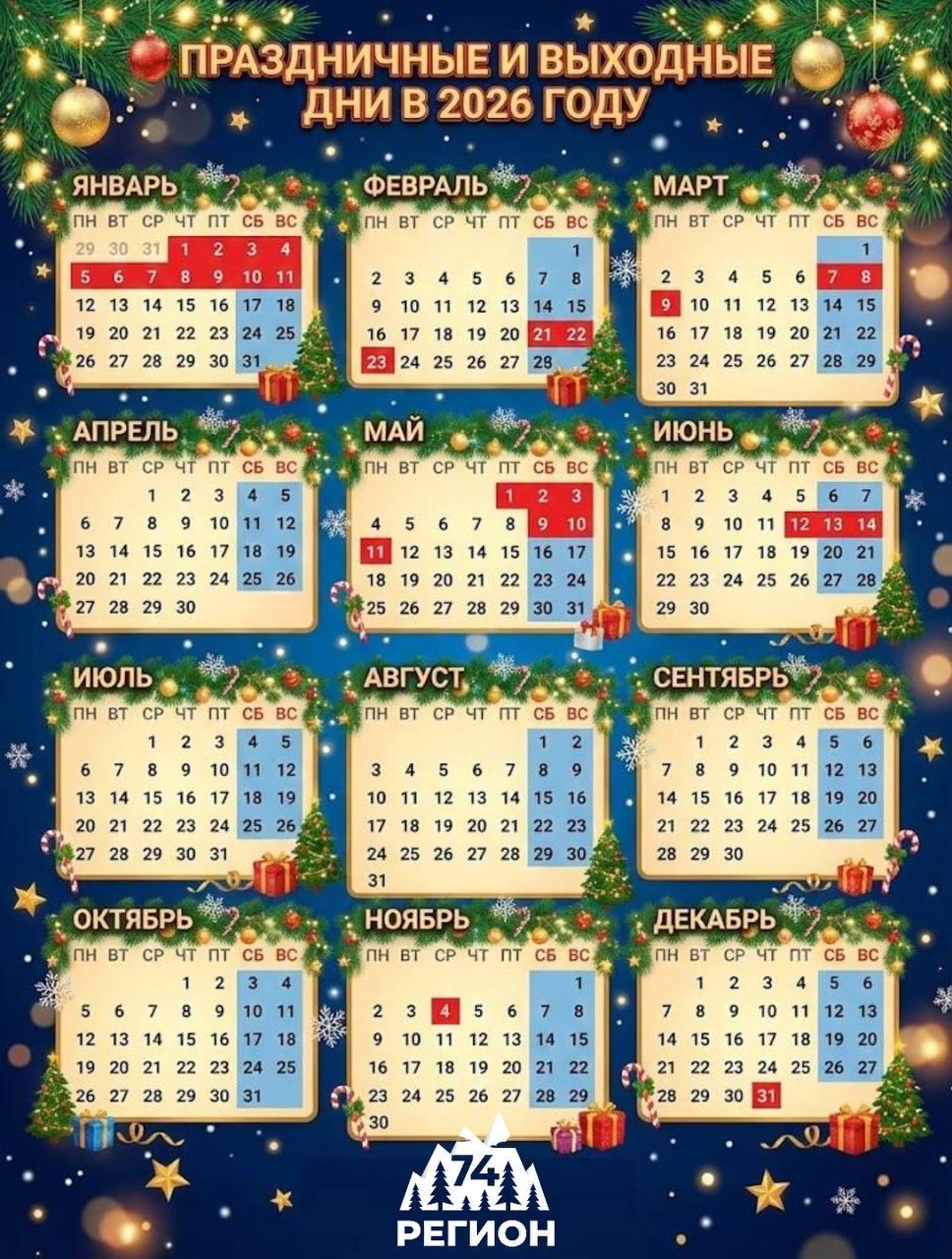 📅 Планируем год заранее Новый 2026-й только вступил в свои права, а расписание рабочих и выходных дней уже готово. Сохраните календарь, чтобы всегда понимать, когда можно строить планы на отдых и отпуск. ❓А вы уже присмотрели даты для отпуска в этом году? 👇 🌄 Расскажи свою новость всему региону. Напиши нам @nashregion74bot