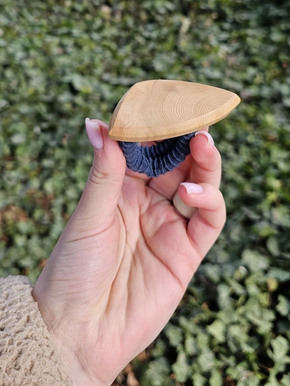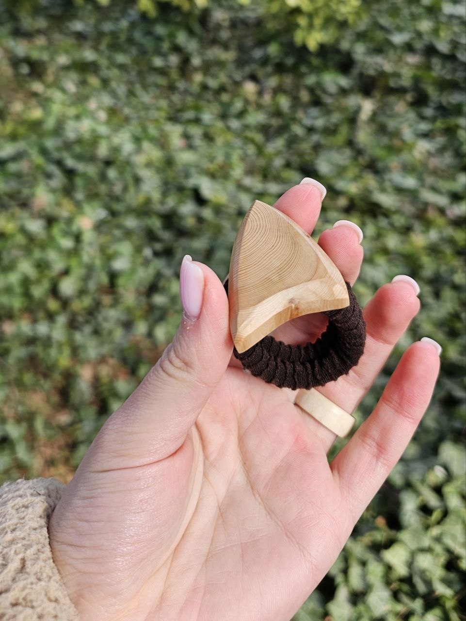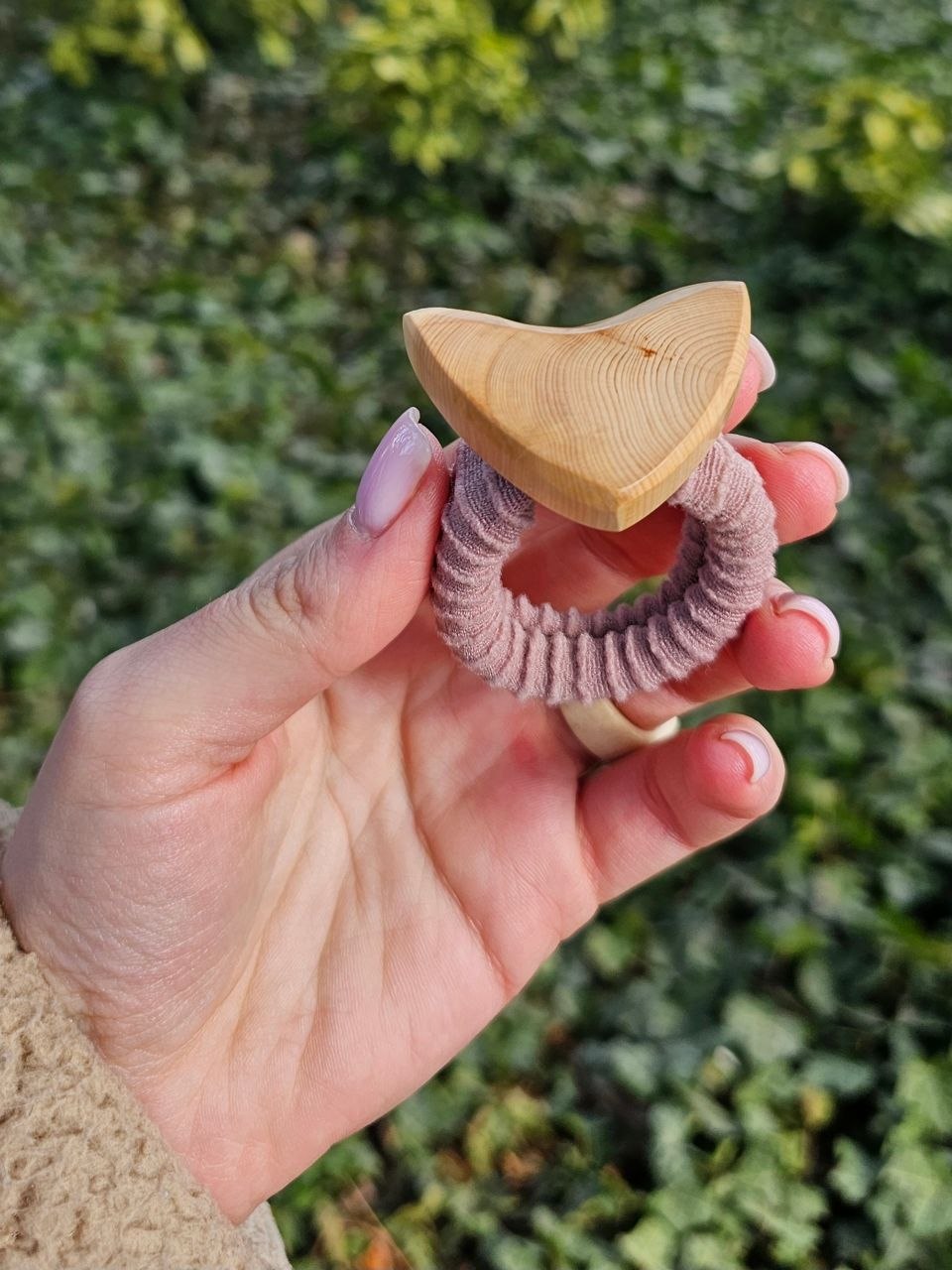 Рог мягкого молочного оттенка с текстурой, похожей на коралл. Эти маленькие углубления мы вырезали вручную — аккуратно, бережно, чтобы материал заиграл по-новому. В центре — натуральный речной жемчуг. Спокойный, с мягким перламутровым свечением.