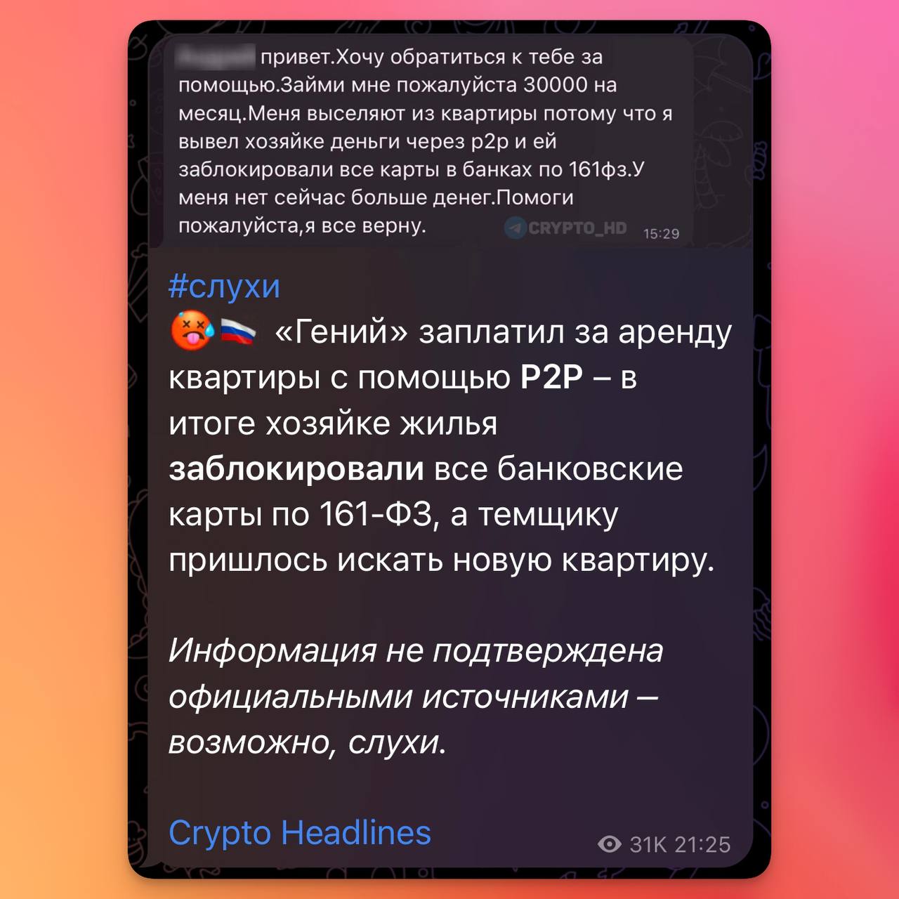 🚫Оплатил аренду квартиры с помощью P2P — получил бан карты по 161-ФЗ.