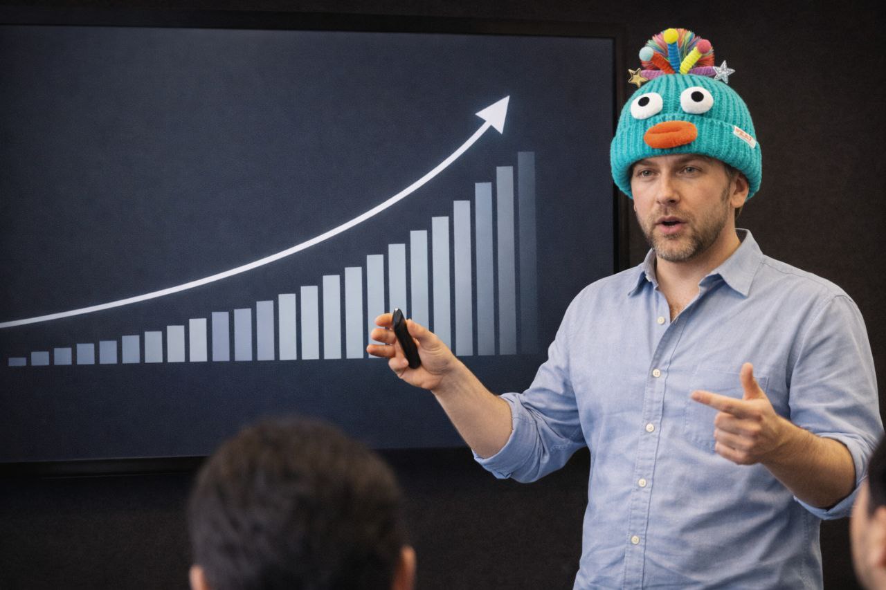 Никого из этих старых пердунов не смутили ни то, что мужик нёс полную чушь (которую я лично диктовал ему в наушник), ни даже то, что всё это время он был в дурацкой шапке с глазами. Никто не задал ни одного вопроса. Мужик не был экспертом, Майк просто привёл какого-то нормиса с улицы и дал свою рубашку за час до презентации.