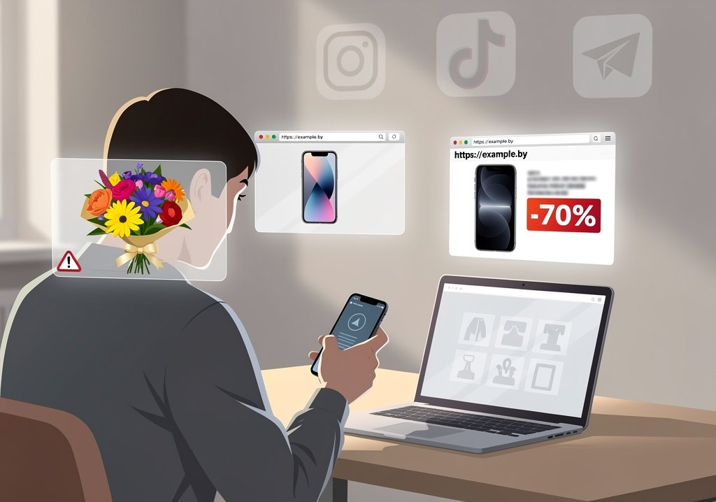 Отсутствие этих данных указывает на фейковую «витрину-призрак». Частые схемы обмана – «цветочный капкан» и «дешевый iPhone», когда требуют 100% предоплату на карту физлица, после чего продавец исчезает. Законные магазины принимают оплату только через эквайринг или ЕРИП на счет юрлица.