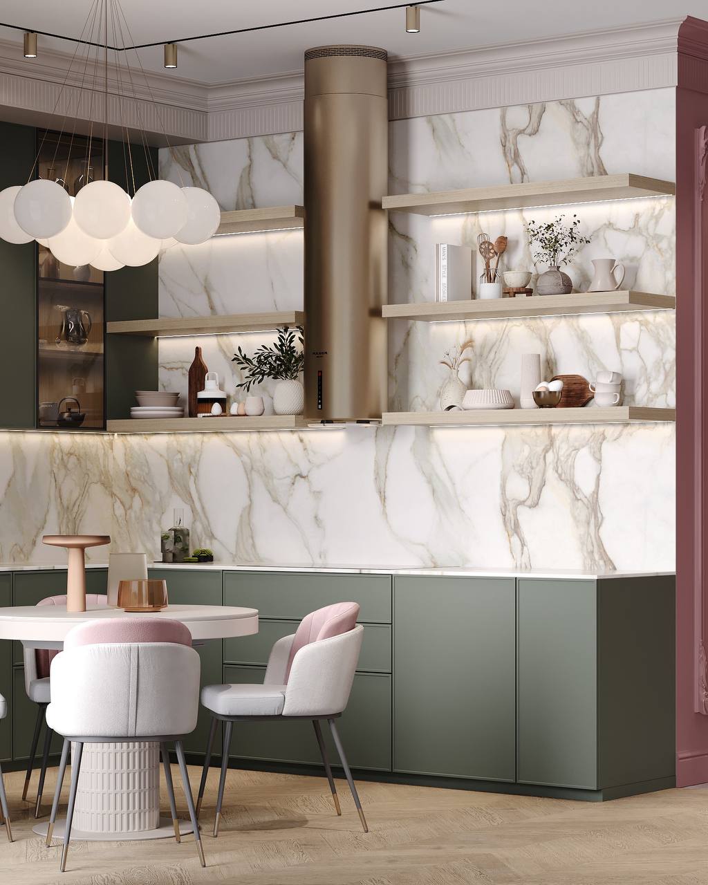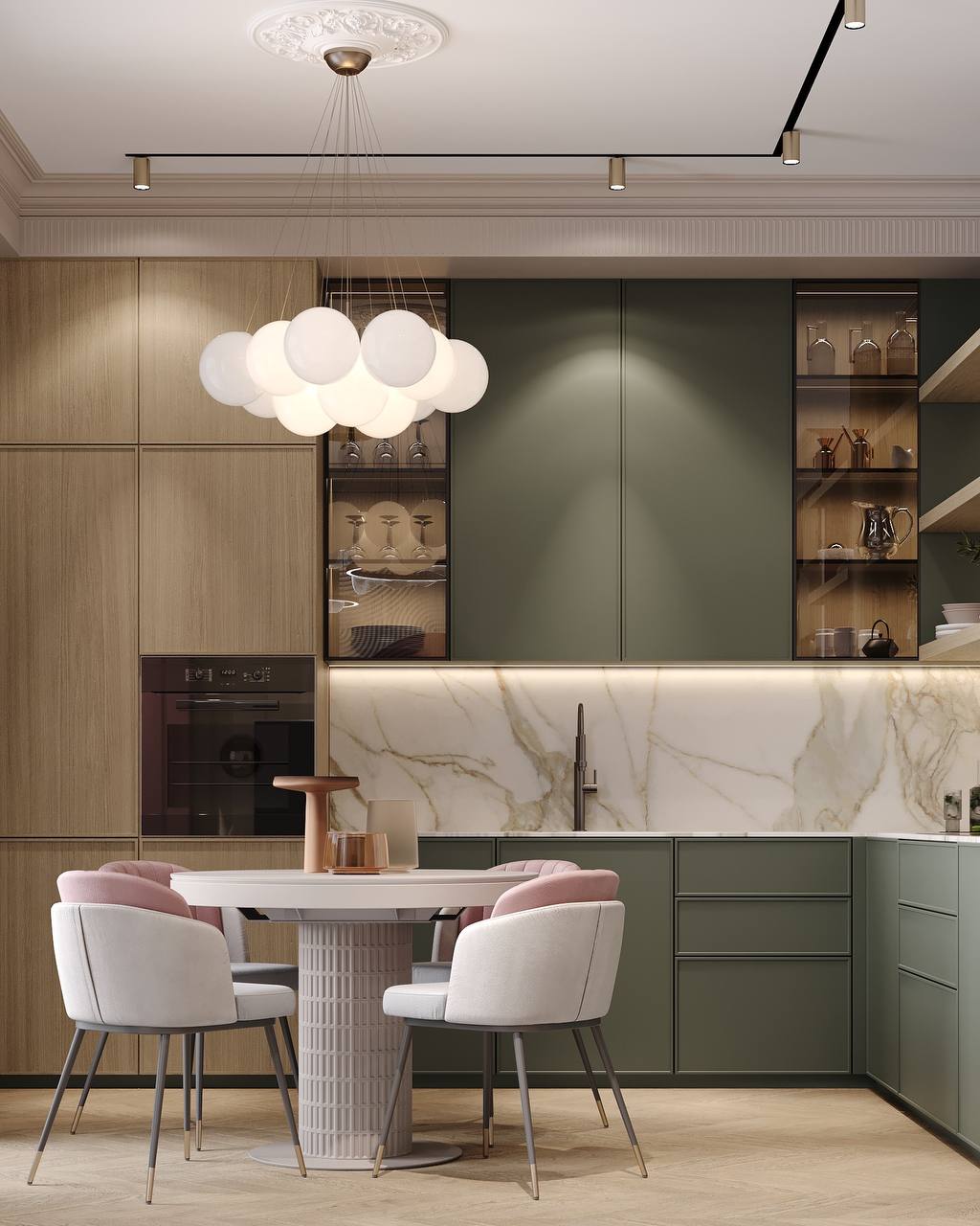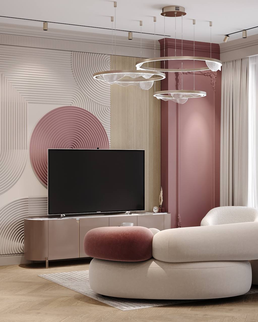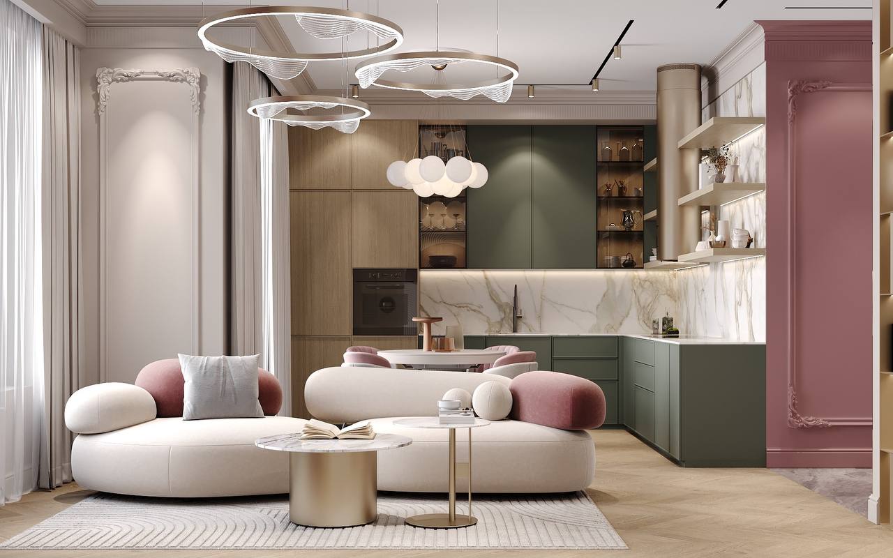 Пространство тишины и мягкого воздуха, где всё будто дышит спокойствием. Пастельные и даже слегка пудровые оттенки создают ощущение утреннего света, даже когда за окном пасмурно.