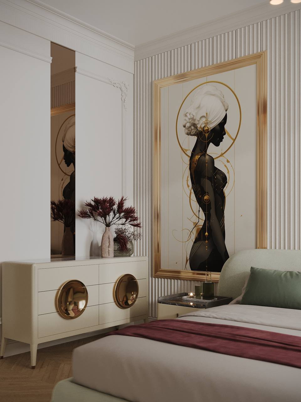 Основу интерьера составляют арт-решения. В центре абсолютно эксклюзивная люстра, которая создаёт все настроение. При этом сам декор минималистичный, но очень тактильный. Мебель играет с самим пространством, не утяжеляя его. В такой спальне нет резких контрастов и визуального шума - всё построено на нюансах, мягкости и ощущении уюта, словно комната обнимает и приглашает замедлиться, выдохнуть и отдохнуть.