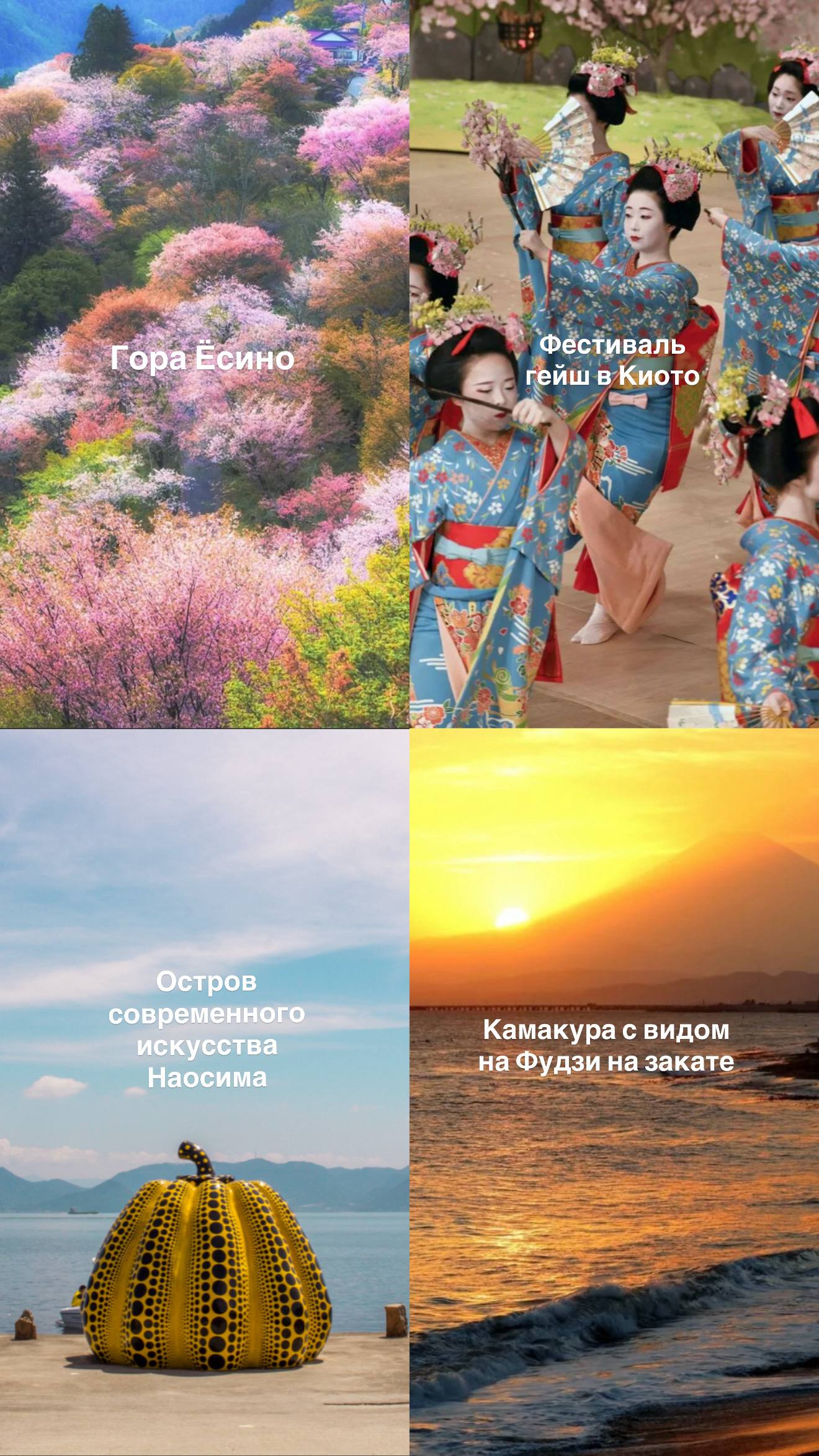 Я столько всего интересного нам нашла: фестиваль гейш в Киото (билеты туда неуловимы), поездка на остров современного искусства Наосима, гора Йосино (вся гора - в розовых сакурах - если не опадут), закат в Камакуре с видом на Фудзи…