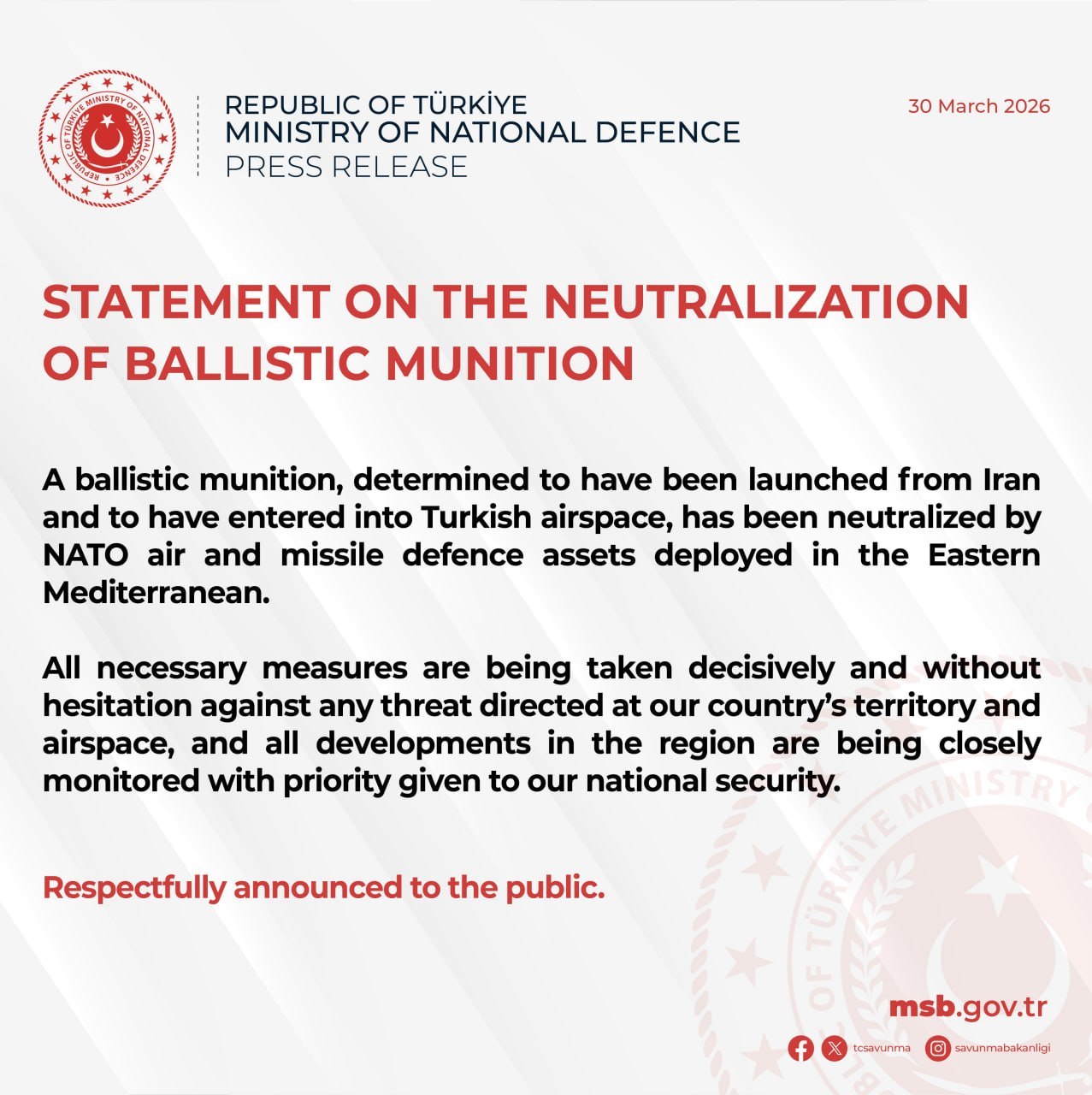 Turkiya Milliy mudofaa vazirligiga ko‘ra, raketa NATOning Sharqiy O‘rta yer dengiziga joylashtirilgan havo va raketaga qarshi mudofaa vositalari tomonidan zararsizlantirilgan.