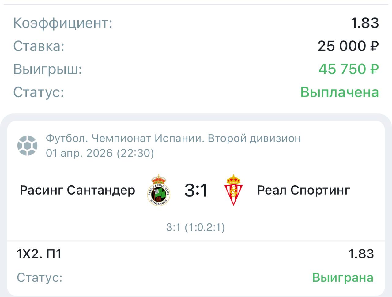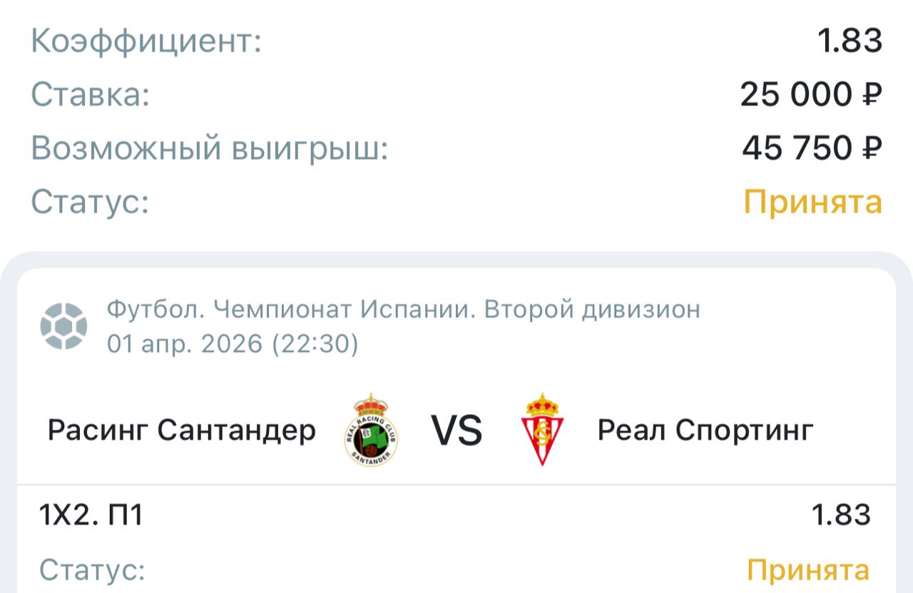 Нам не верится в третью подряд осечку от хозяев поля. В прошлом матче они сенсационно уступили "Реалу Сарагосе" во многом из-за того, что половина основы не смогла принять участие в игре. В целом, "Расинг" на своем поле хорош и выиграл в четырех из пяти последних домашних поединков. "Спортинг" же забыл вкус побед, а также оказался слабее в трех из четырех прошлых выездных встреч. Хозяевам ни в коем случае нельзя больше оступаться, чтобы не дать ни шанса своим конкурентам, поэтому в их мотивации сомнений нет.