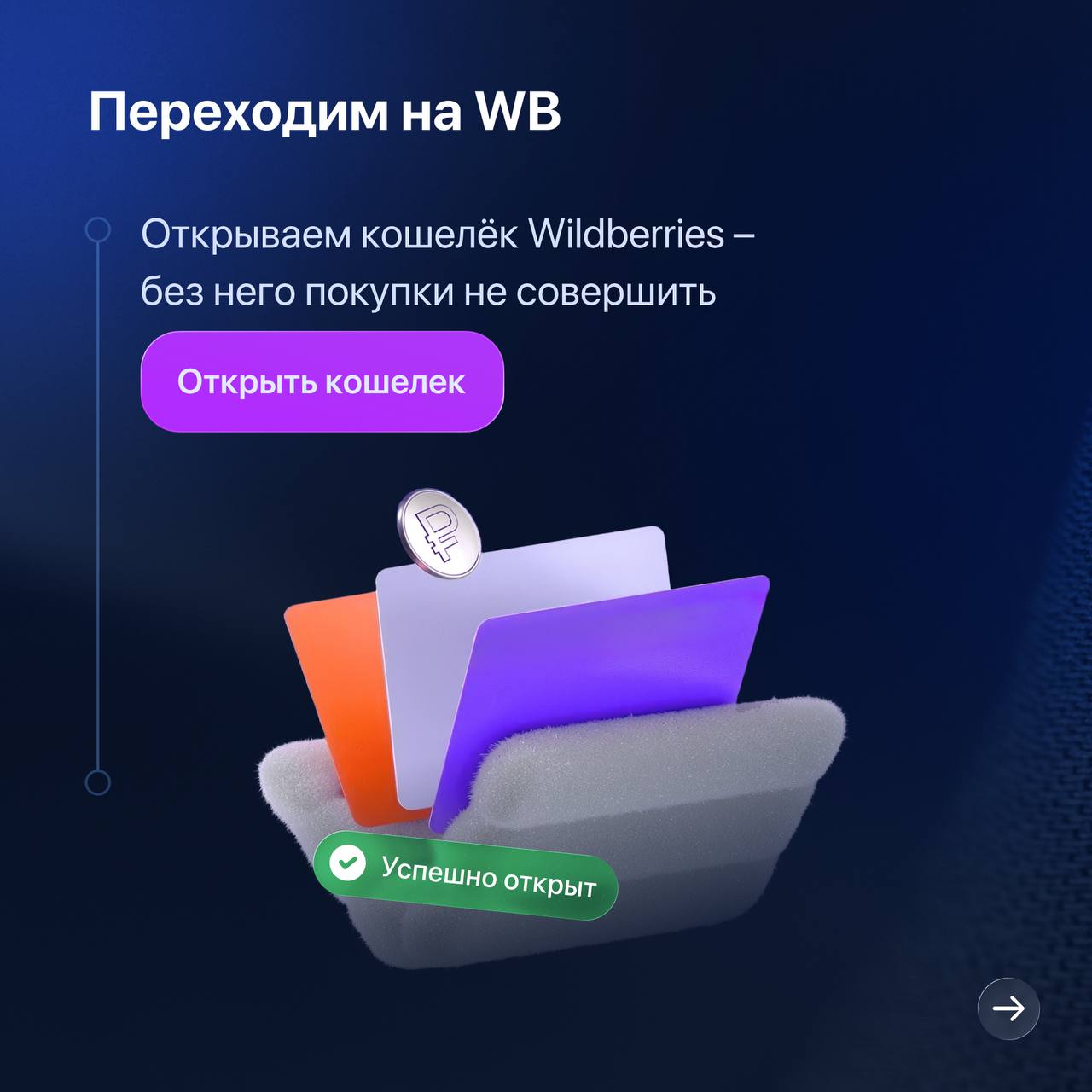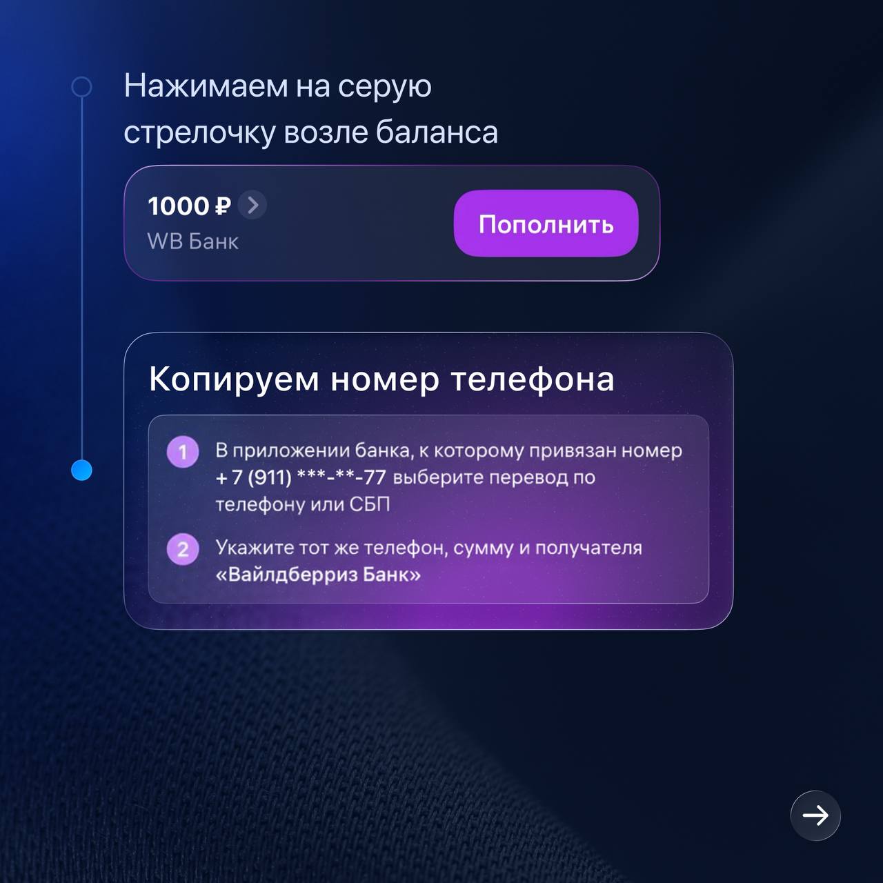В прикреплённых карточках пошагово разобрал процесс пополнения WB перед оплатой корзины. И всё это при помощи Antarctic Wallet 🐧