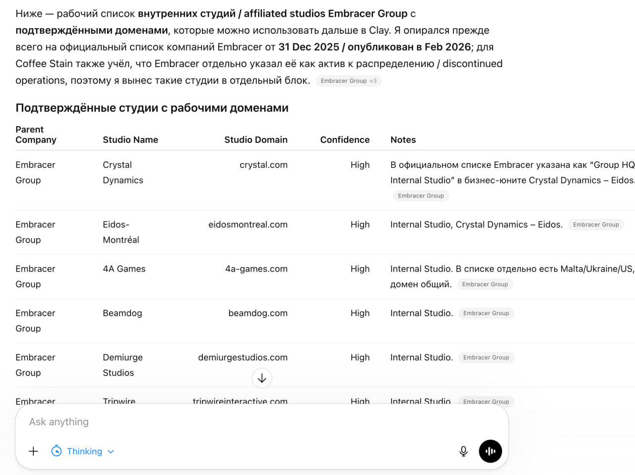 2. Добавлять в базу и проверять домены всех дочерних и материнских организаций, которые могут иметь отношение к вашему проекту (на скриншотах пример из продажи аутсорса в геймдев — с одними гипотезами стучимся в "мамку" Embracer Group, по другим вопросам пингуем менеджмент локальных студий).