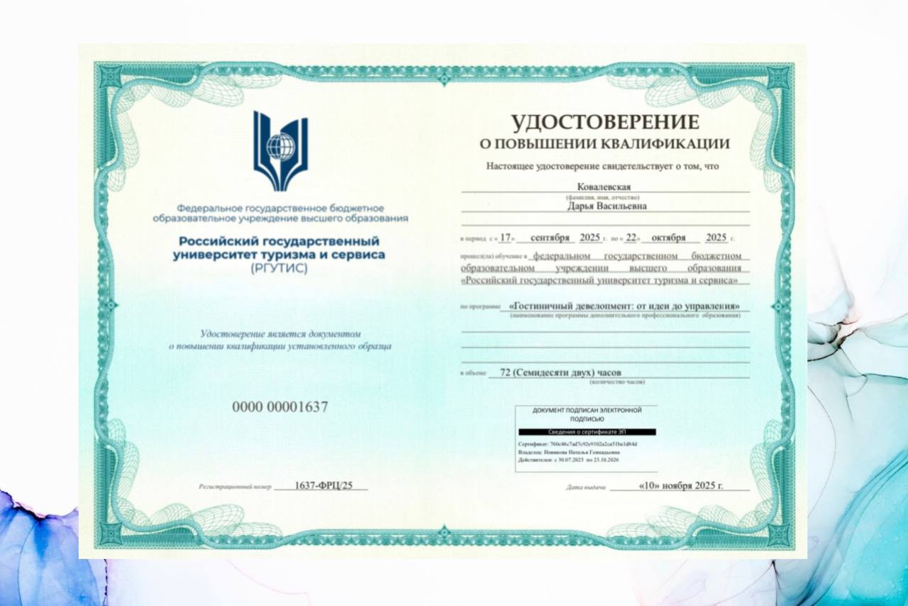 Мой выбор — постоянное развитие. Именно поэтому я подтвердила свою квалификацию на курсе «Гостиничный девелопмент: от идеи до управления» в Российском государственном университете туризма и сервиса (РГУТиС) и получила очередной диплом!