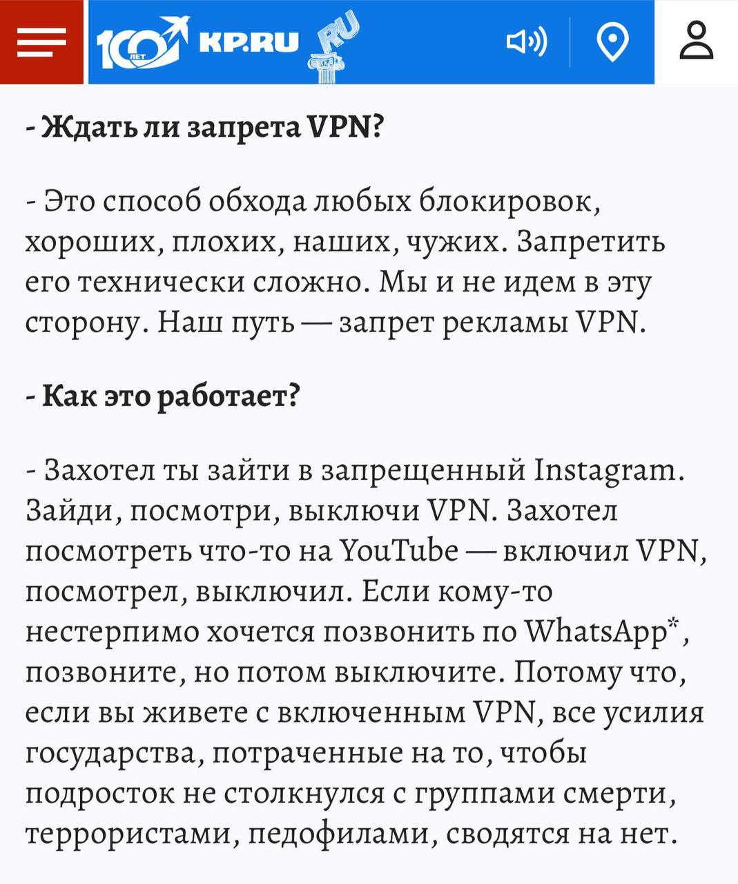 Формально депутат говорит: VPN не запрещаем, но «жить с включённым VPN» нельзя, нужно включать его только под конкретную задачу и тут же выключать.