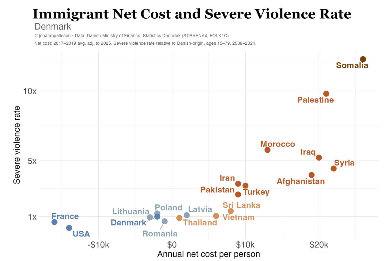 Статистика из Дании показывает, что мигранты из развитых стран, а также Индии не только не создают фискальную нагрузку, но и имеют более низкий уровень преступности.