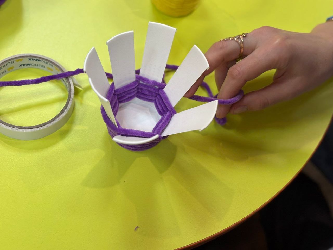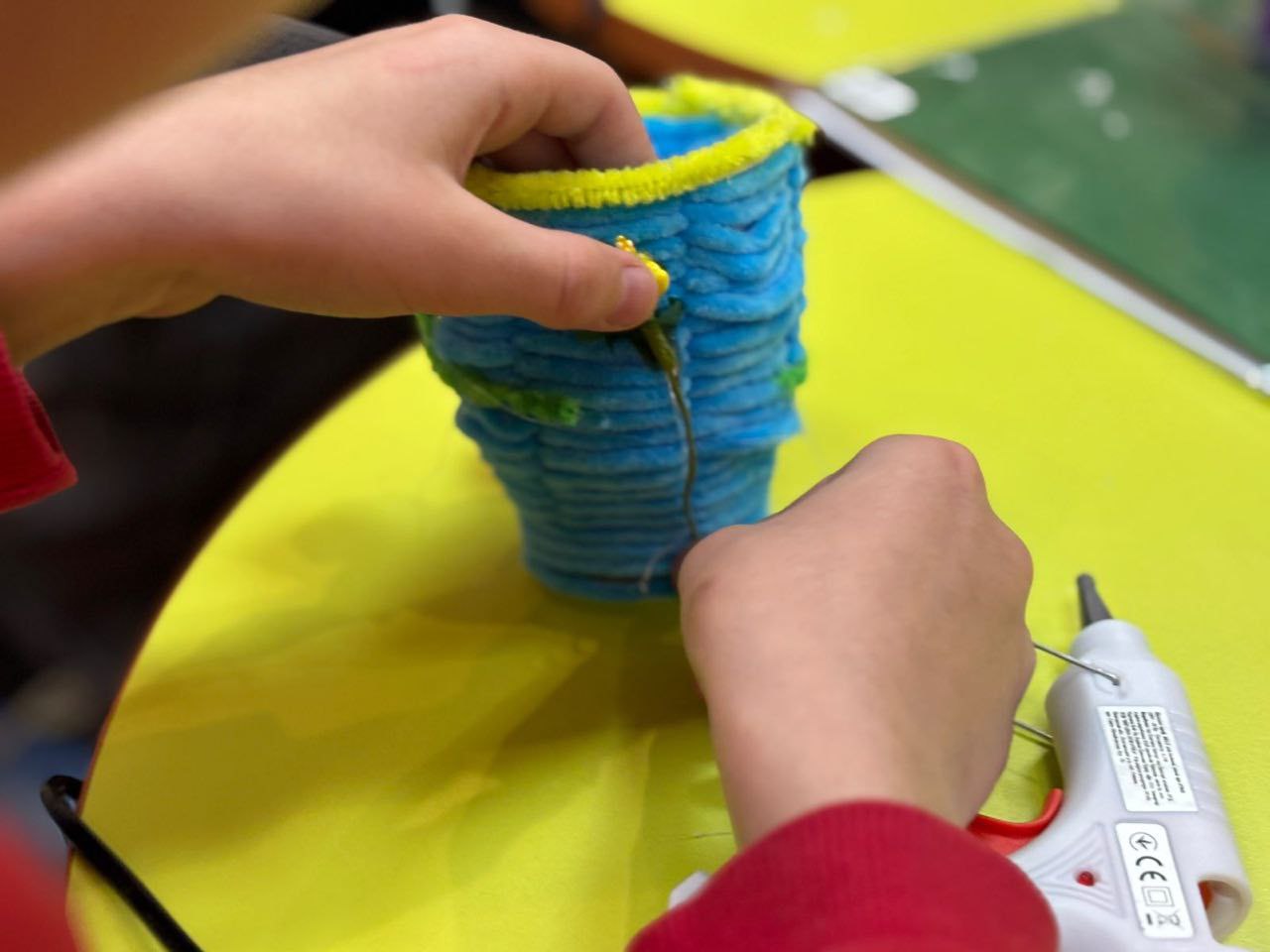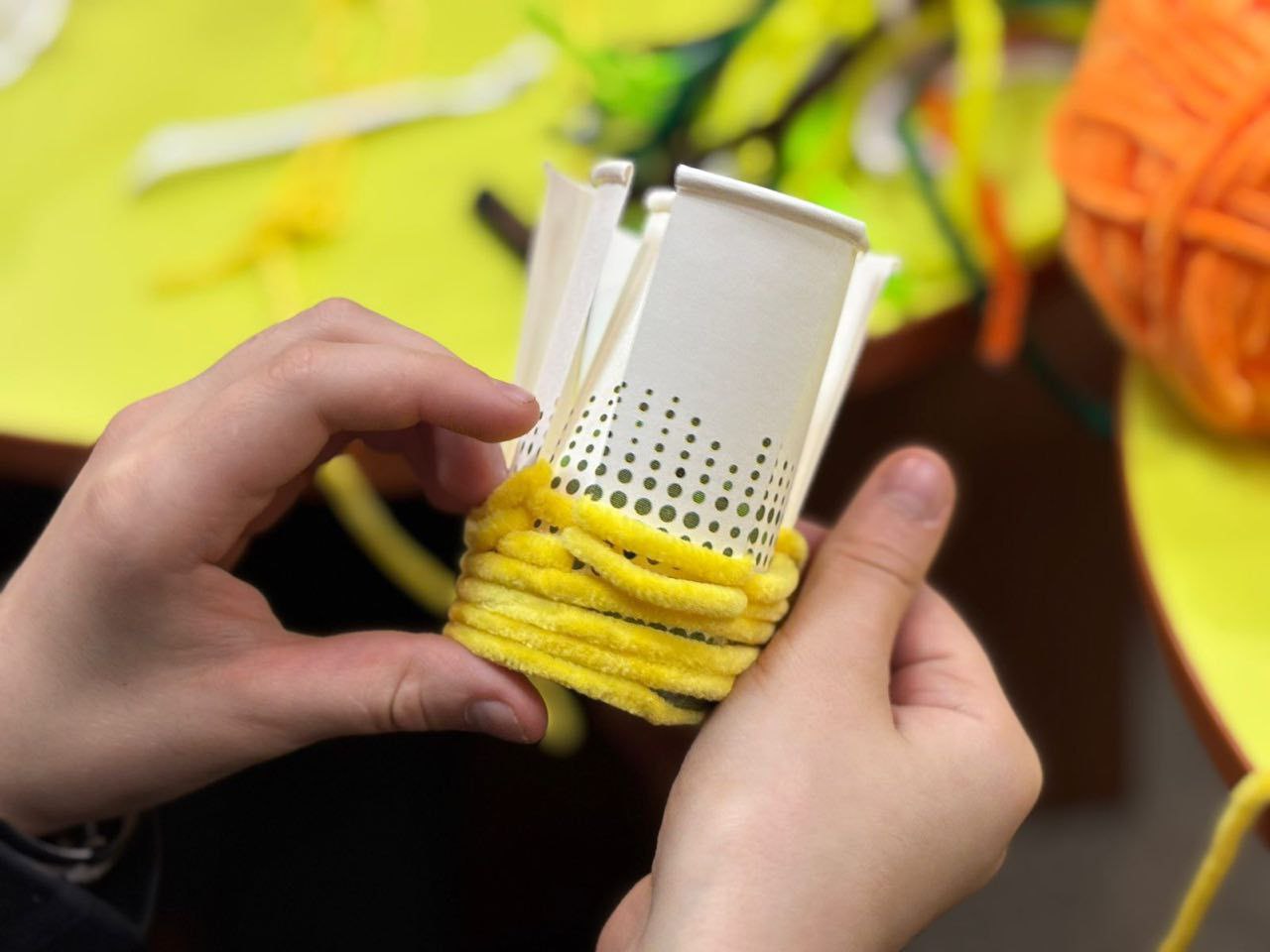 Юні учасники виготовляли декоративні вазочки, перетворюючи паперові стаканчики на охайні та стильні прикраси. Велюрові нитки та декоративні квіти додали виробам ніжності й затишку.
