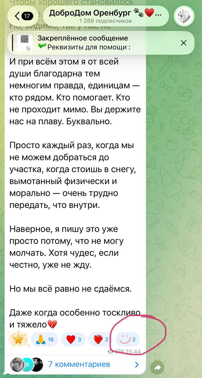 Мне неприятно это писать. Мне правда обидно. Я смотрю каналы, где 100–200–300 подписчиков, и люди там объединяются, поддерживают, помогают закрывать долги, покупать необходимое. А у нас в канале больше тысячи человек, и иногда не набирается даже 2–3 тысячи, чтобы закрыть оплату передержки.