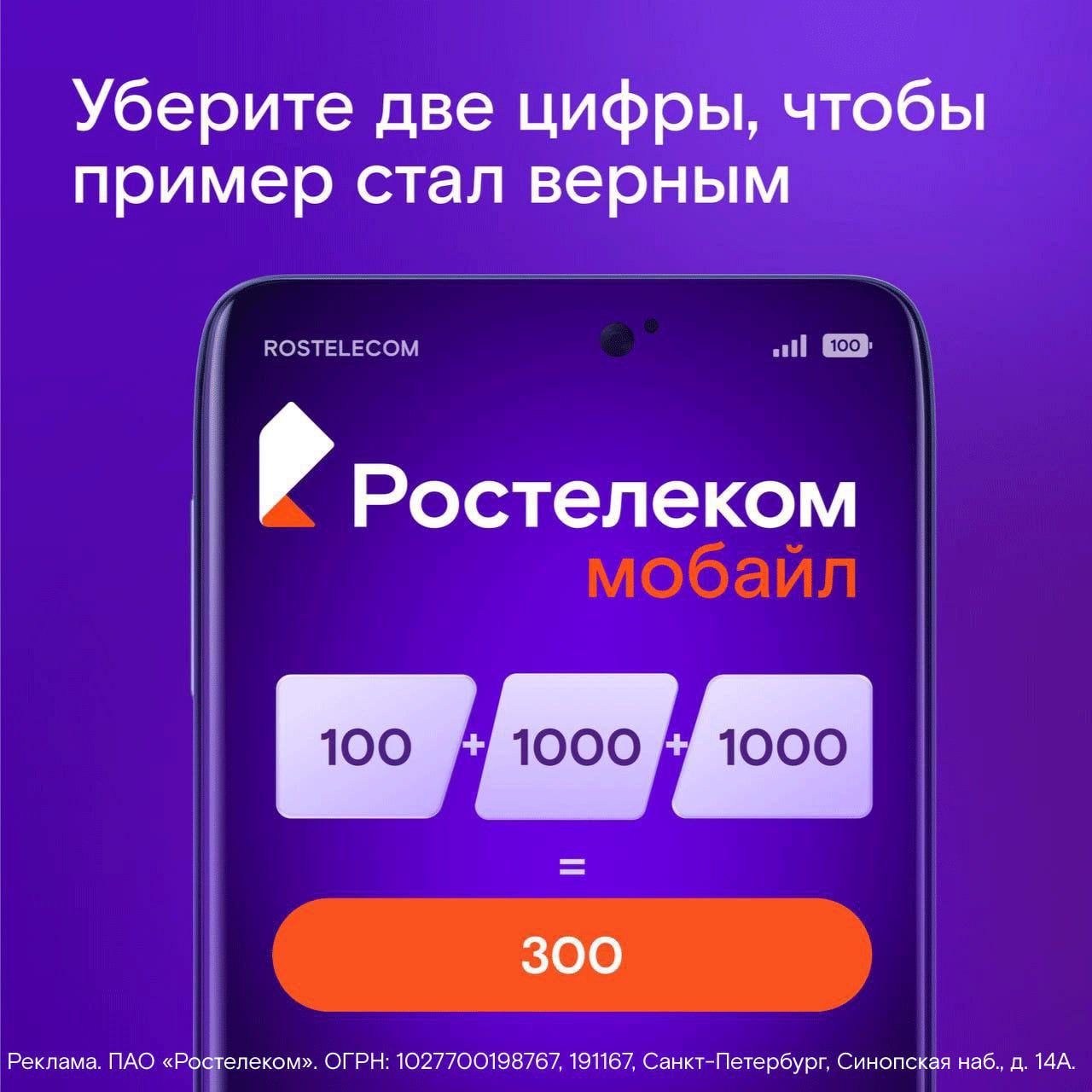 Задание со звездочкой для самых внимательных. Уберите две цифры, чтобы пример стал верным. Правильный ответ без правок: С Ростелеком Мобайл ничего менять не нужно. В тарифе "Первый мобильный" 100 ГБ + 1 000 минут + 1 000 СМС = 300 рублей в месяц. И эта цена не на один раз. До 2027 года никаких изменений. Сим-карту можно заказать онлайн с бесплатной доставкой, а со своим номером — вообще красота (ещё и бонусы дают). Подключайтесь и ставьте себе "5" за экономию и выбор качества!