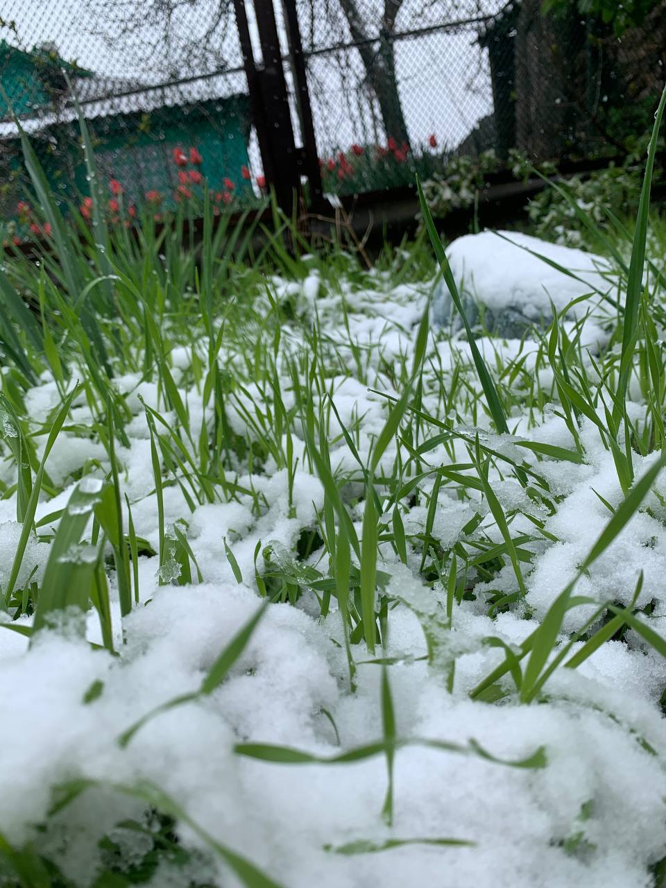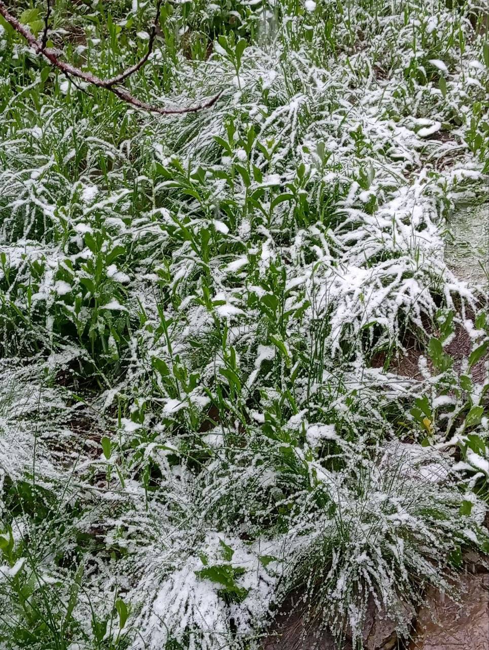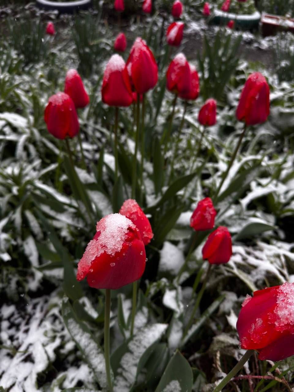 На снимках, которые местные жители публикуют в социальных сетях, видно зелёные деревья, покрытые снегом, а также тюльпаны, на которых лежит снежный покров.