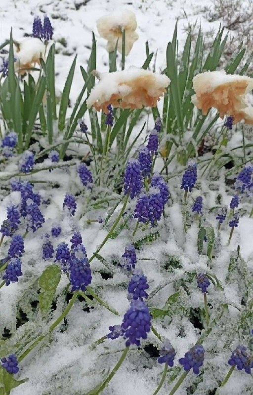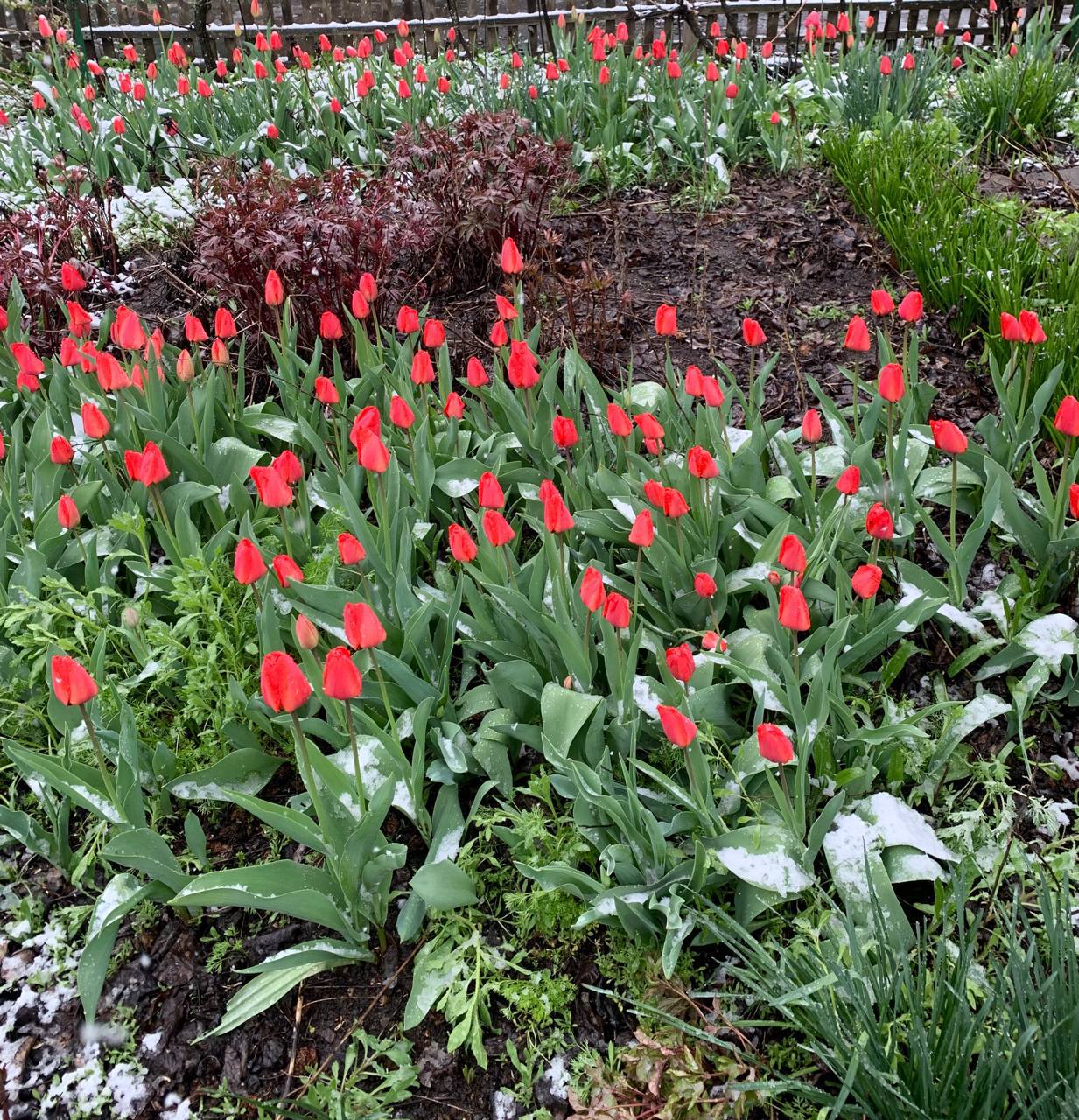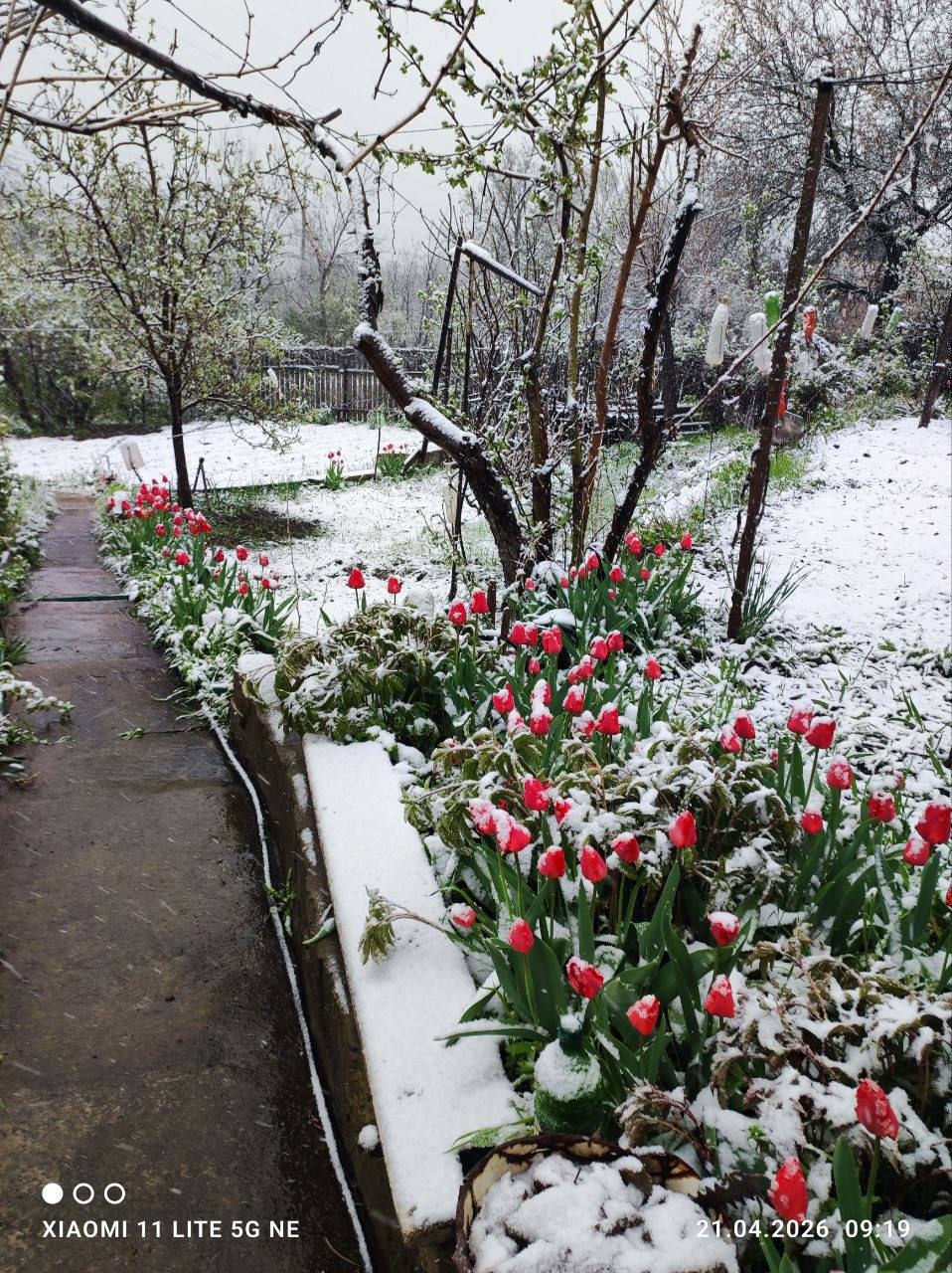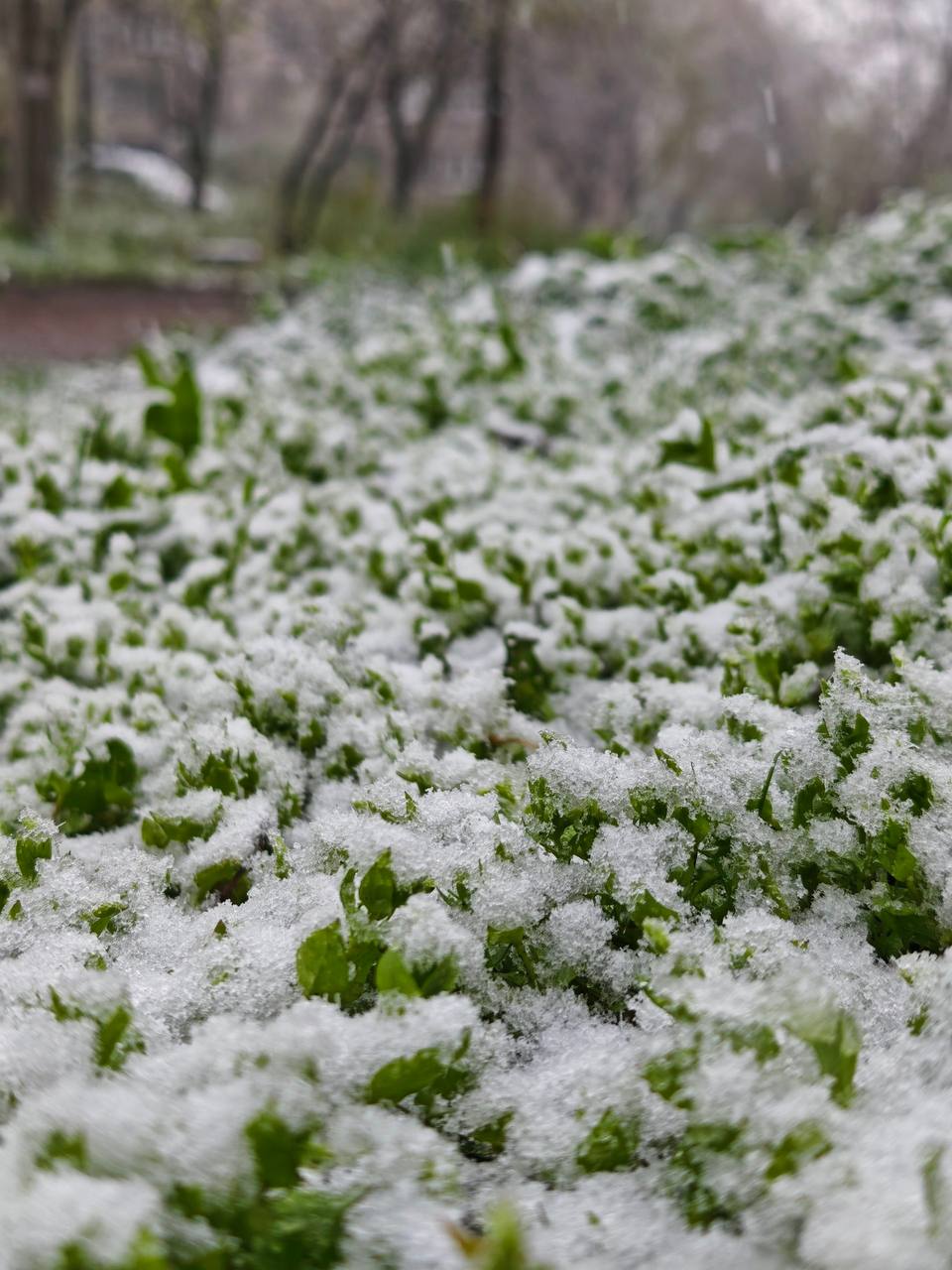 На снимках, которые местные жители публикуют в социальных сетях, видно зелёные деревья, покрытые снегом, а также тюльпаны, на которых лежит снежный покров.