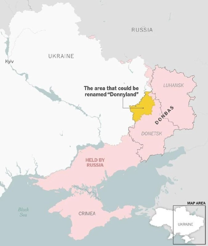 Идея возникла полушутя, но обсуждалась всерьёз как возможный нейтральный или демилитаризованный регион, который мог бы стать «проектом Трампа» и сдерживающим фактором. Однако Россия настаивает на полном контроле над Донбассом, а Украина не готова уступать территорию, поэтому переговоры зашли в тупик — The New York Times.