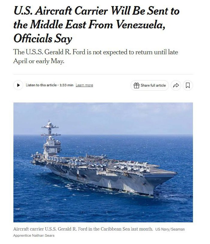 🇺🇸🇮🇷⚡️ Авианосец USS Gerald R. Ford и его эскортные корабли, недавно направленные в Карибский бассейн, теперь должны отправиться на Ближний Восток и, как ожидается, не вернутся в свои порты приписки до конца апреля или начала мая, сообщает NYT.