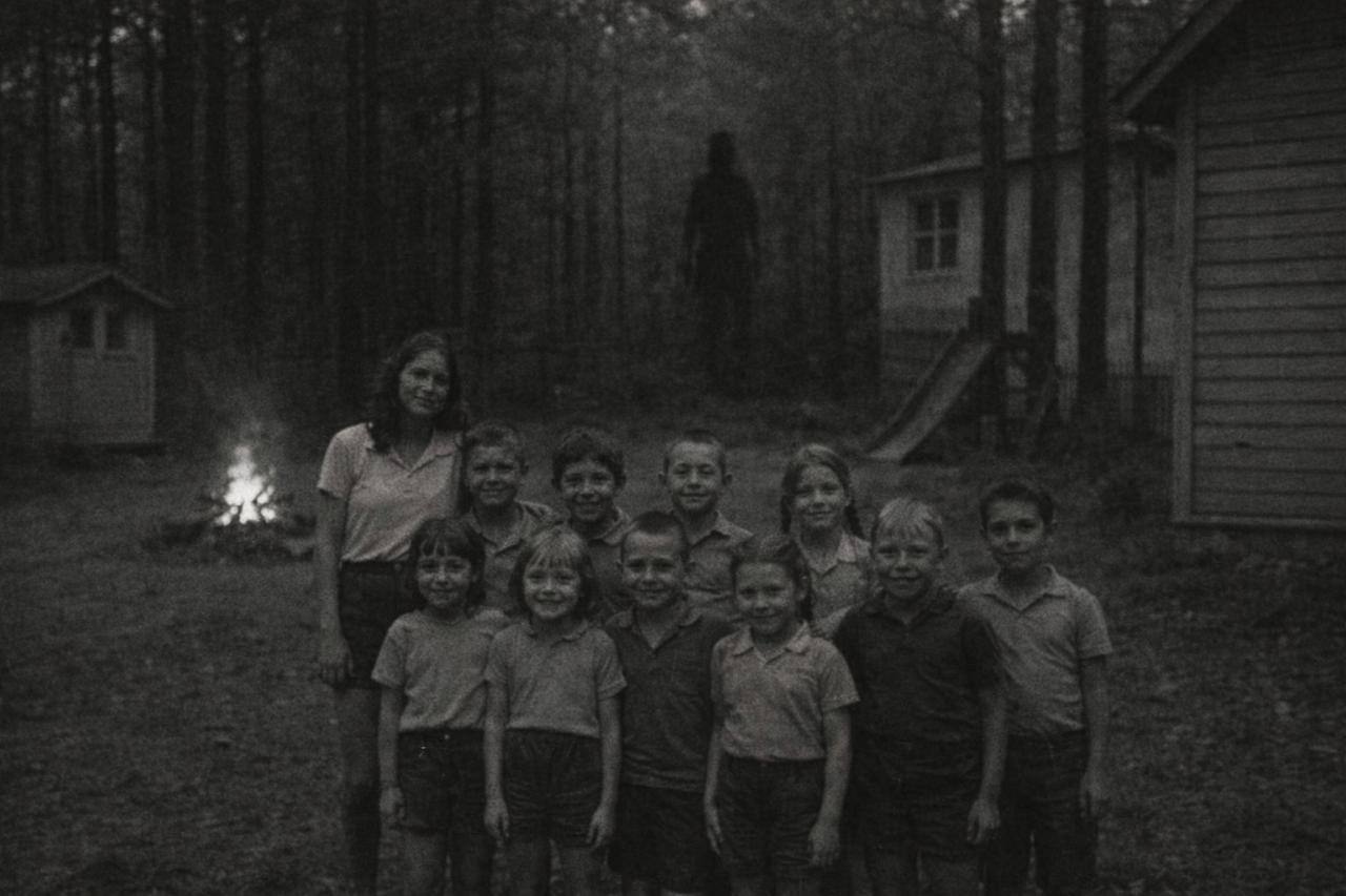 На нём — последний вечер смены в лагере «Луна», 1975 год. 20 детей и вожатая. Улыбки, костёр, обычный летний кадр.
