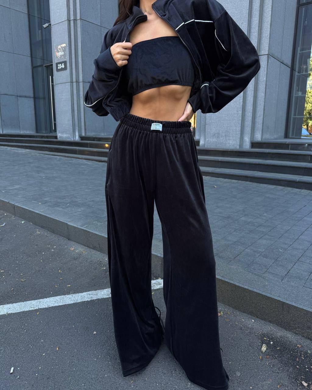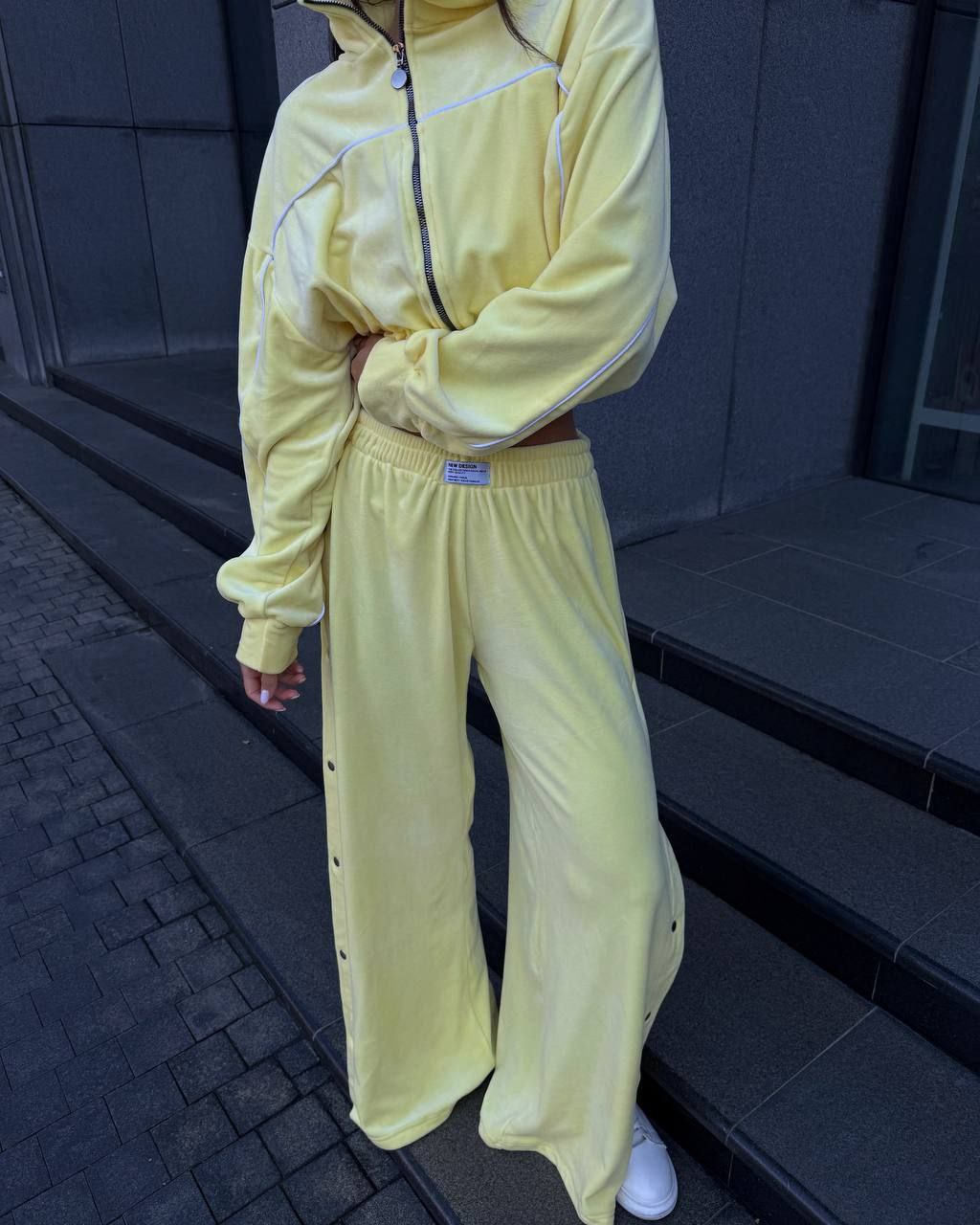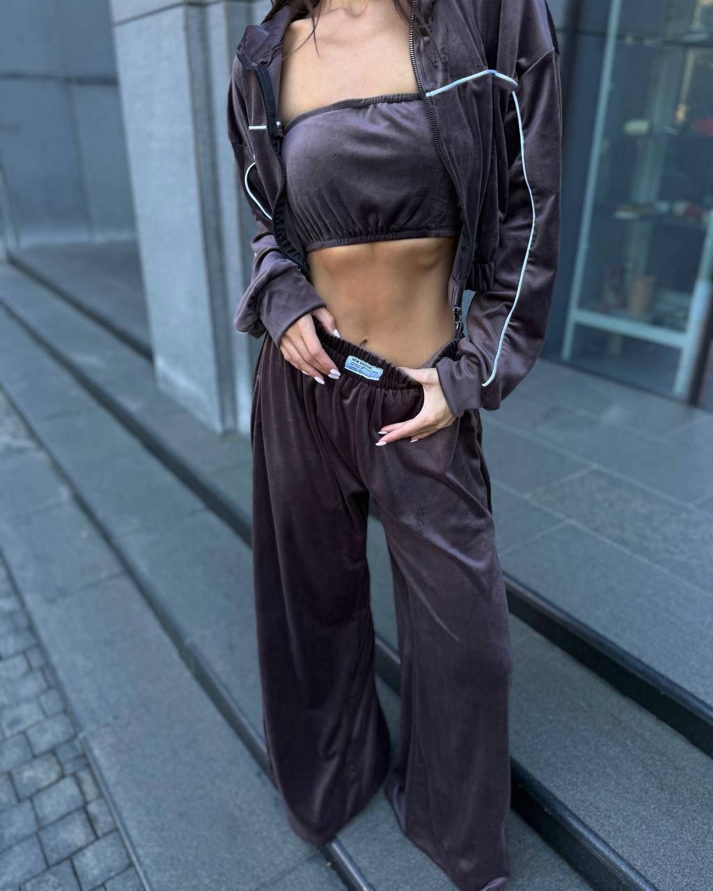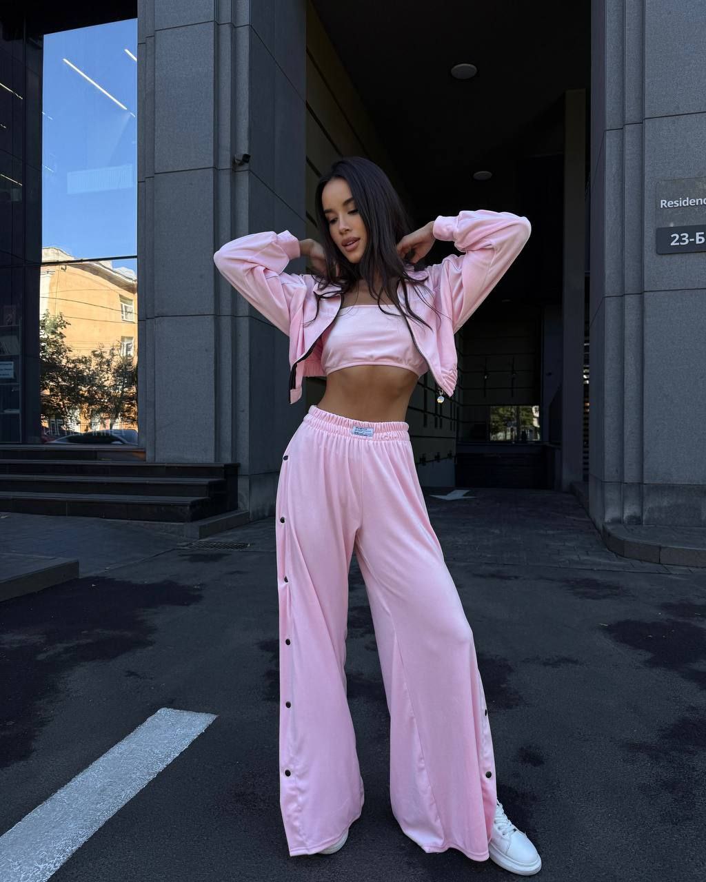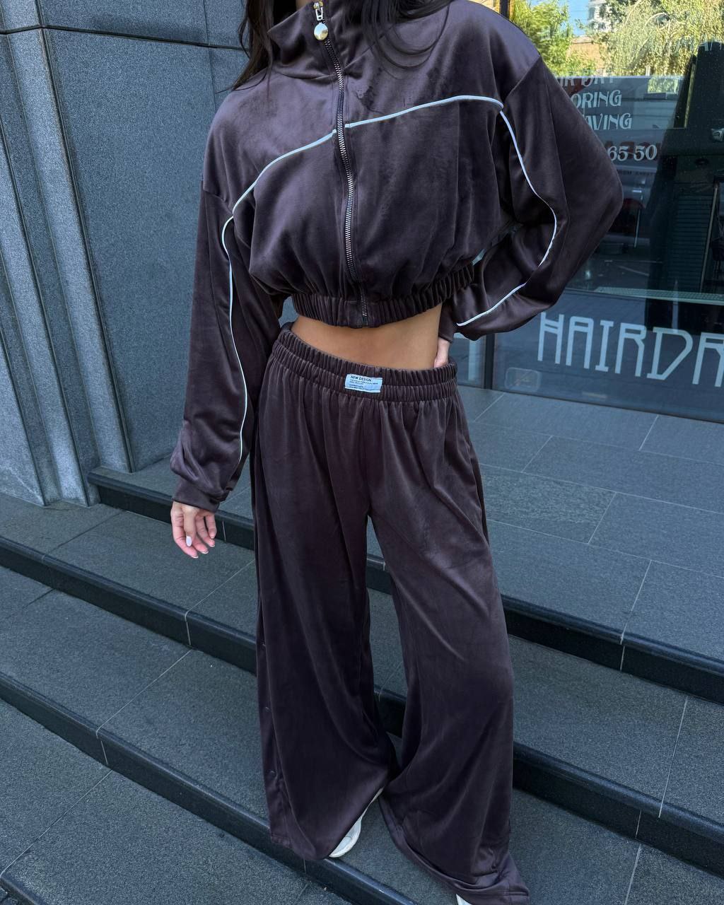 Ідеальний костюм з приємного мʼякого велюру. Складається з кофти, топу бандо та штанів на закльопках по боках. Кофта йде вкорочена на змійці, з кантом. Топ на резинці.