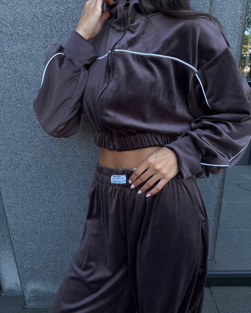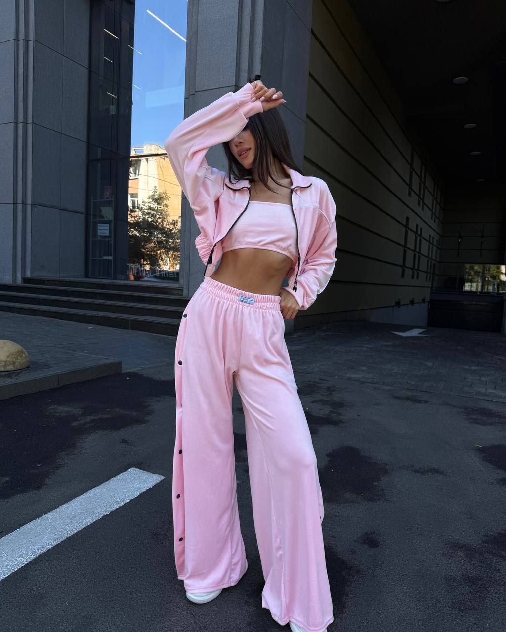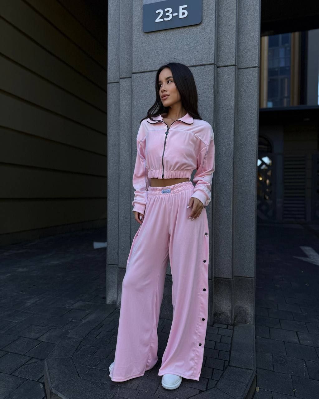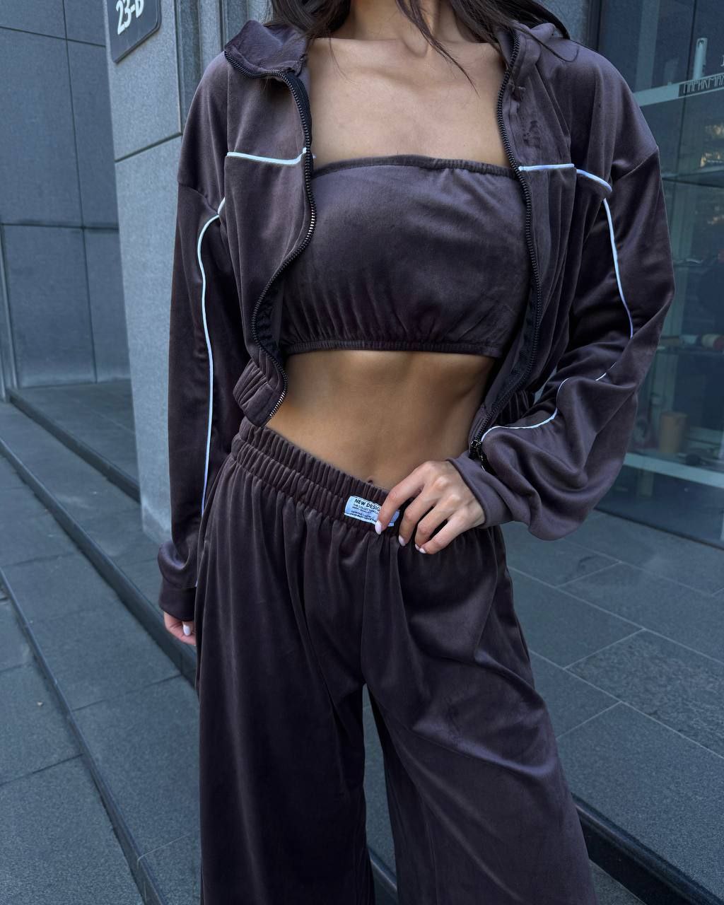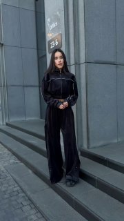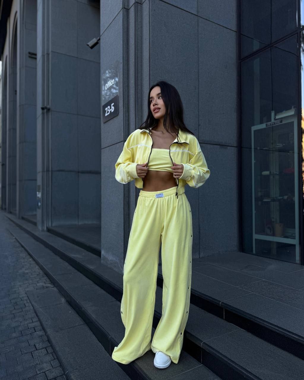 Ідеальний костюм з приємного мʼякого велюру. Складається з кофти, топу бандо та штанів на закльопках по боках. Кофта йде вкорочена на змійці, з кантом. Топ на резинці.