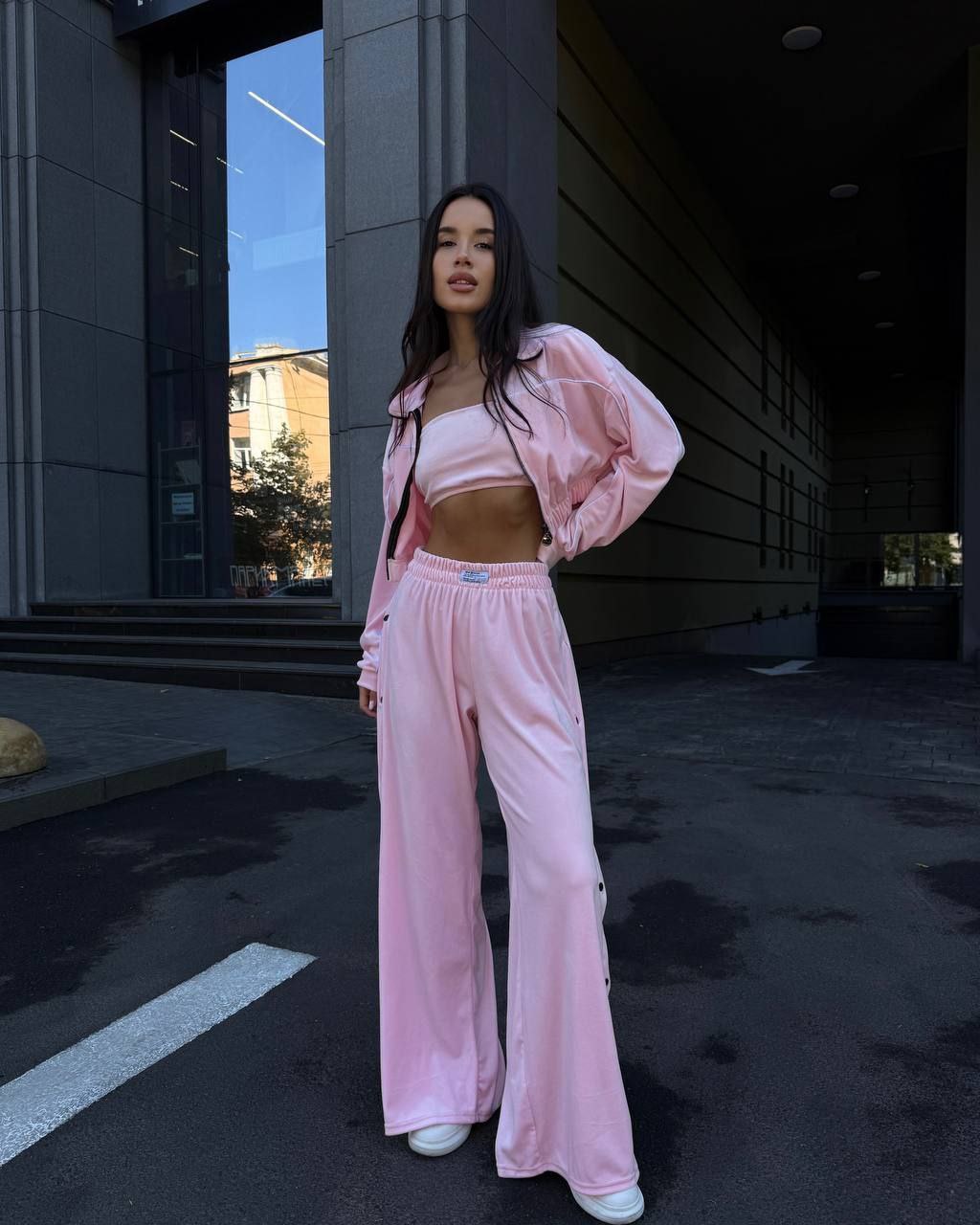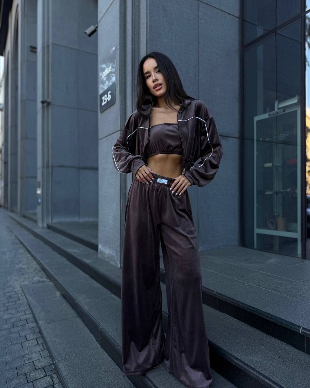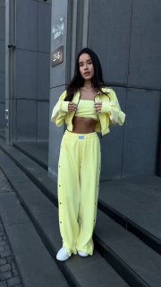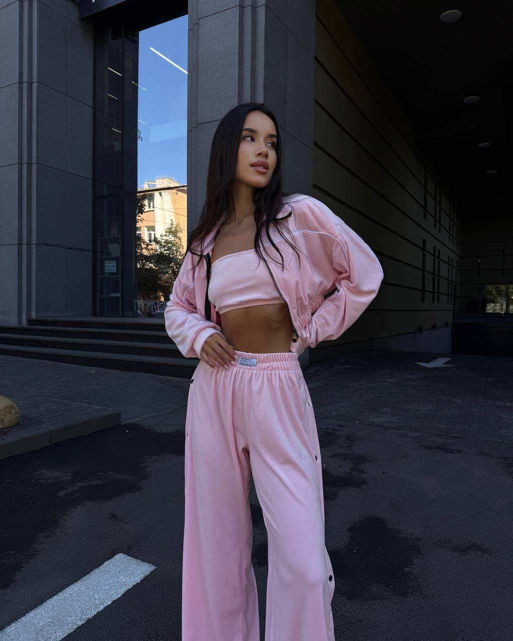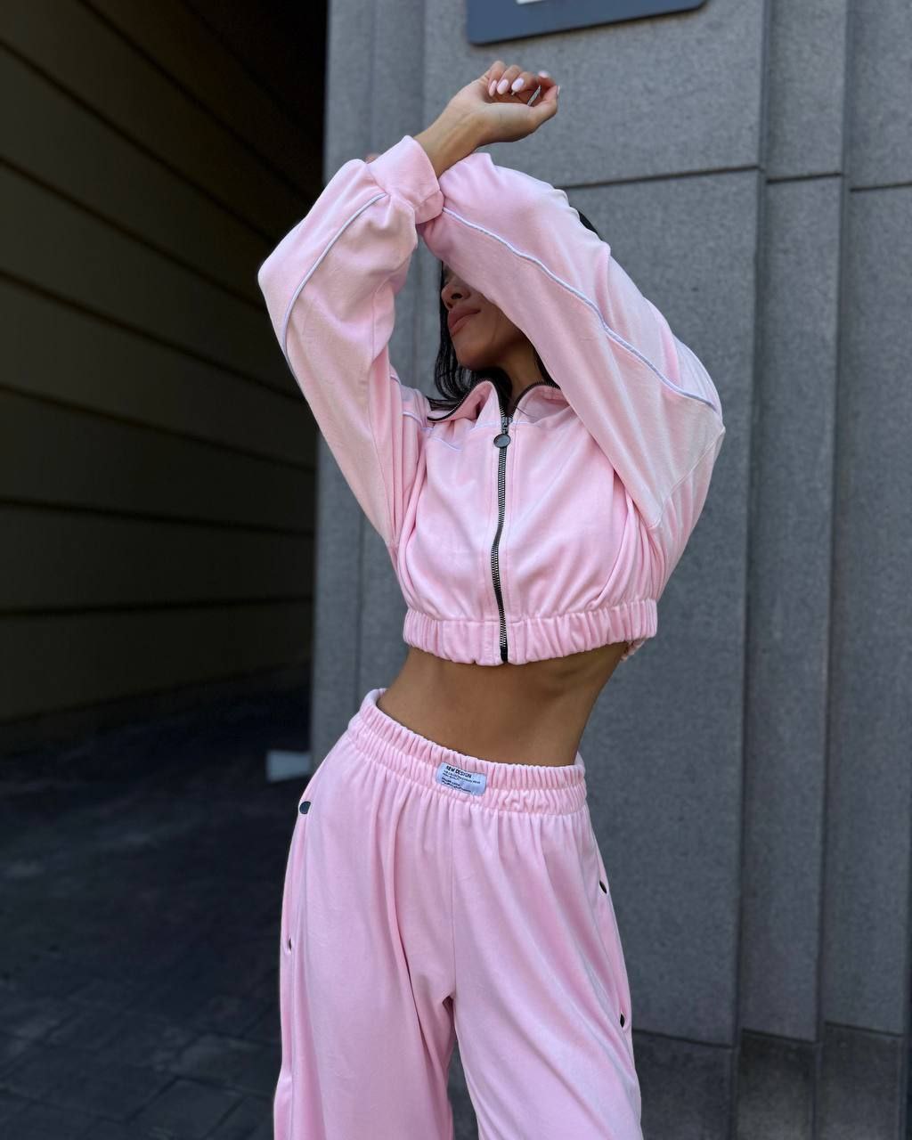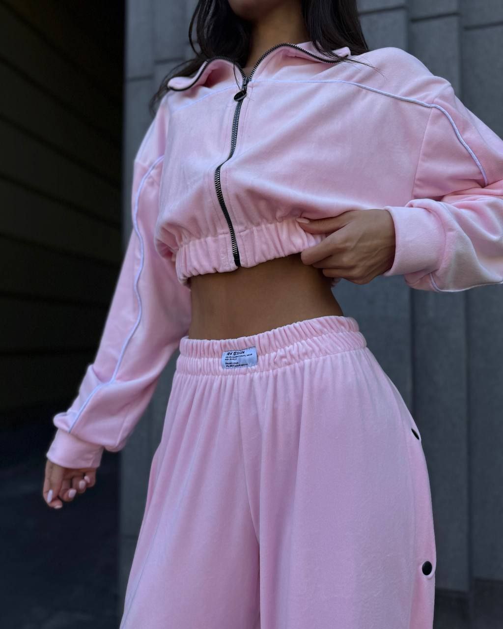 Ідеальний костюм з приємного мʼякого велюру. Складається з кофти, топу бандо та штанів на закльопках по боках. Кофта йде вкорочена на змійці, з кантом. Топ на резинці.