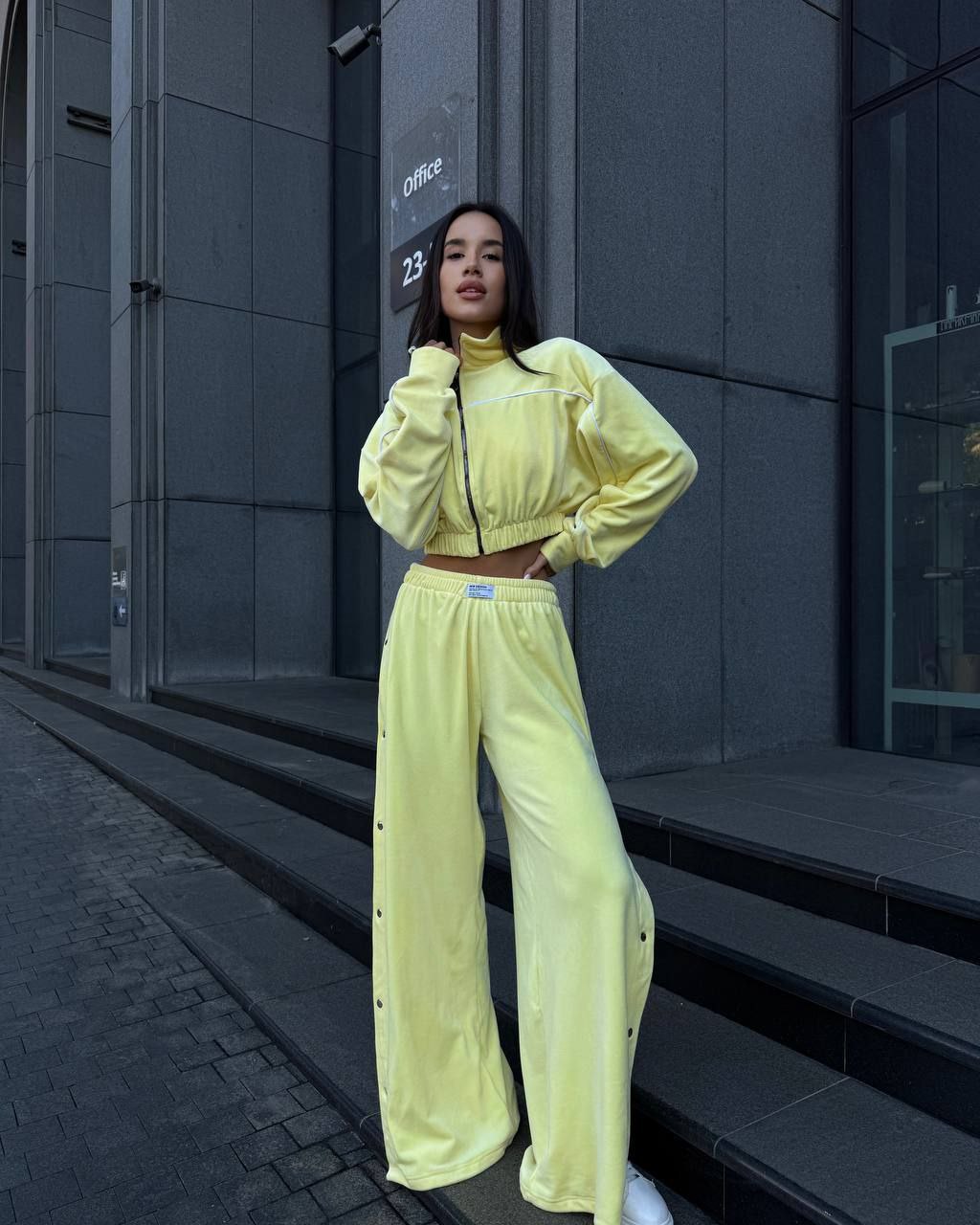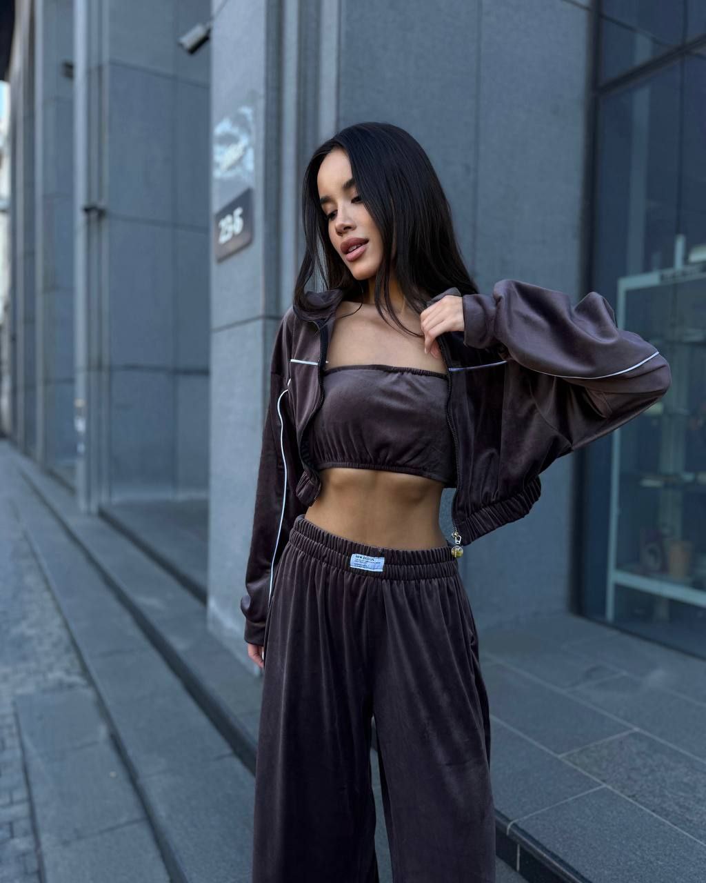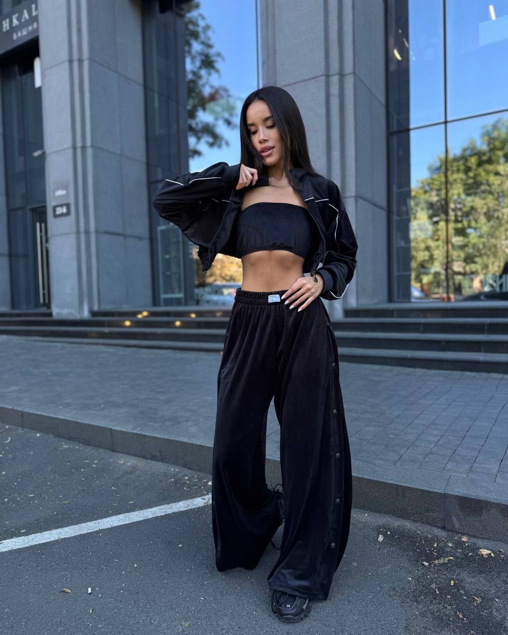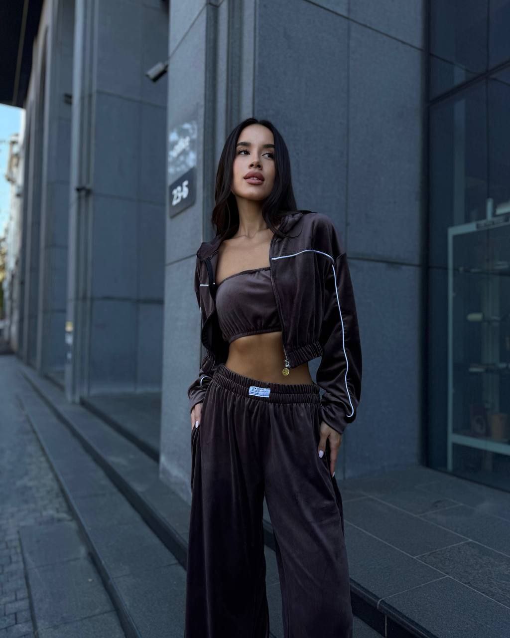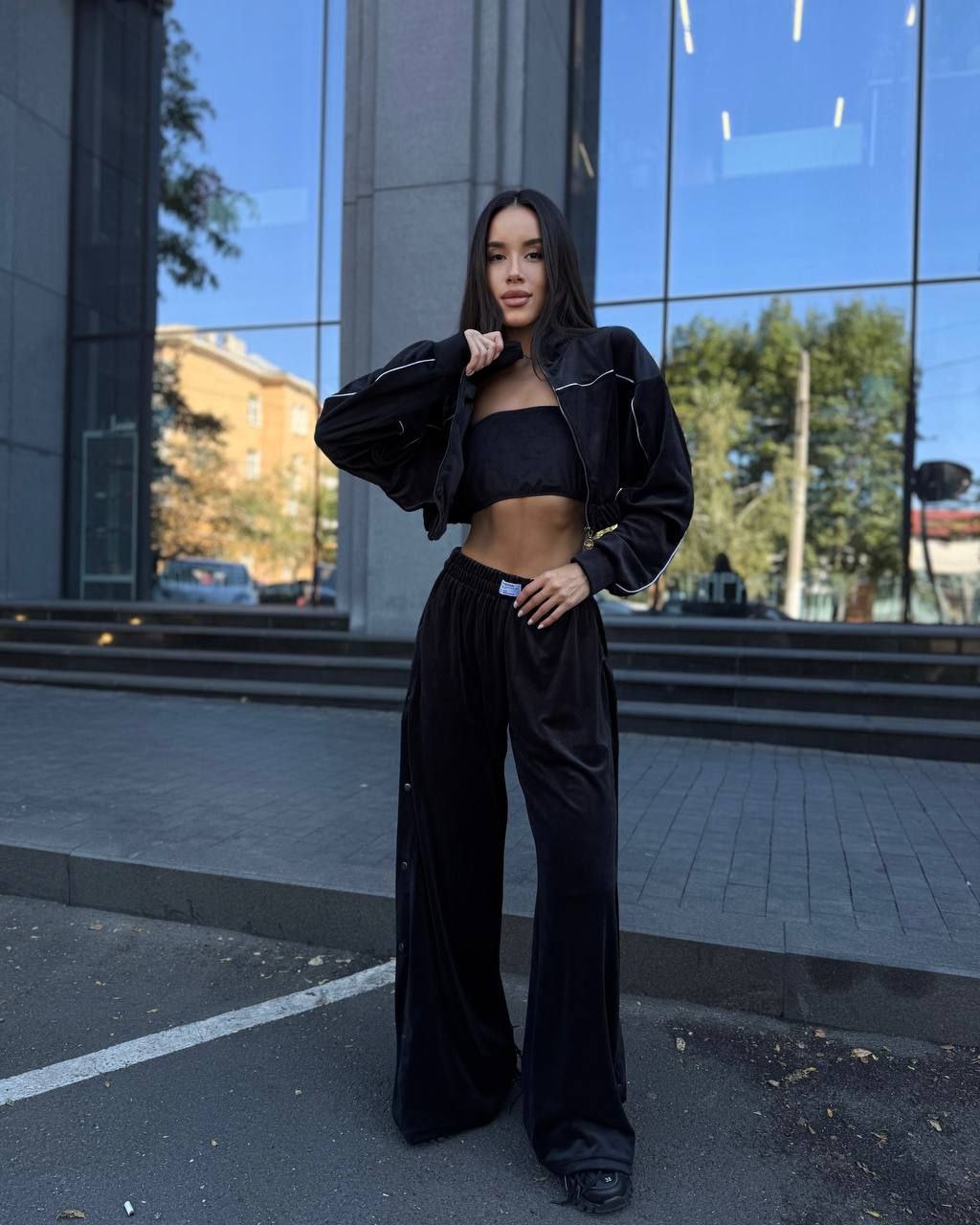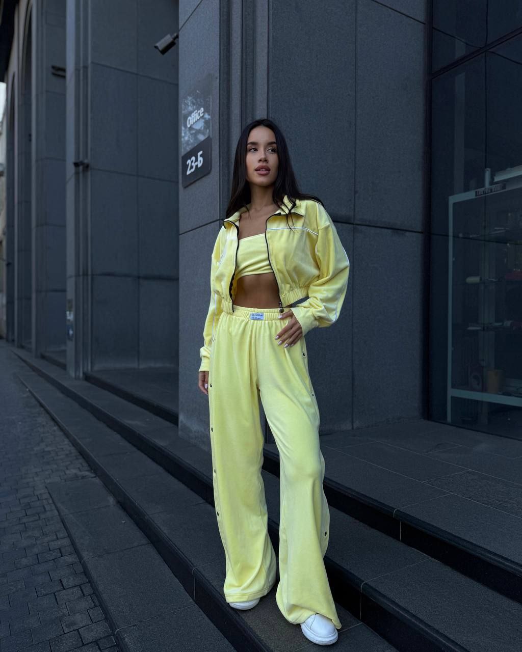 Ідеальний костюм з приємного мʼякого велюру. Складається з кофти, топу бандо та штанів на закльопках по боках. Кофта йде вкорочена на змійці, з кантом. Топ на резинці.