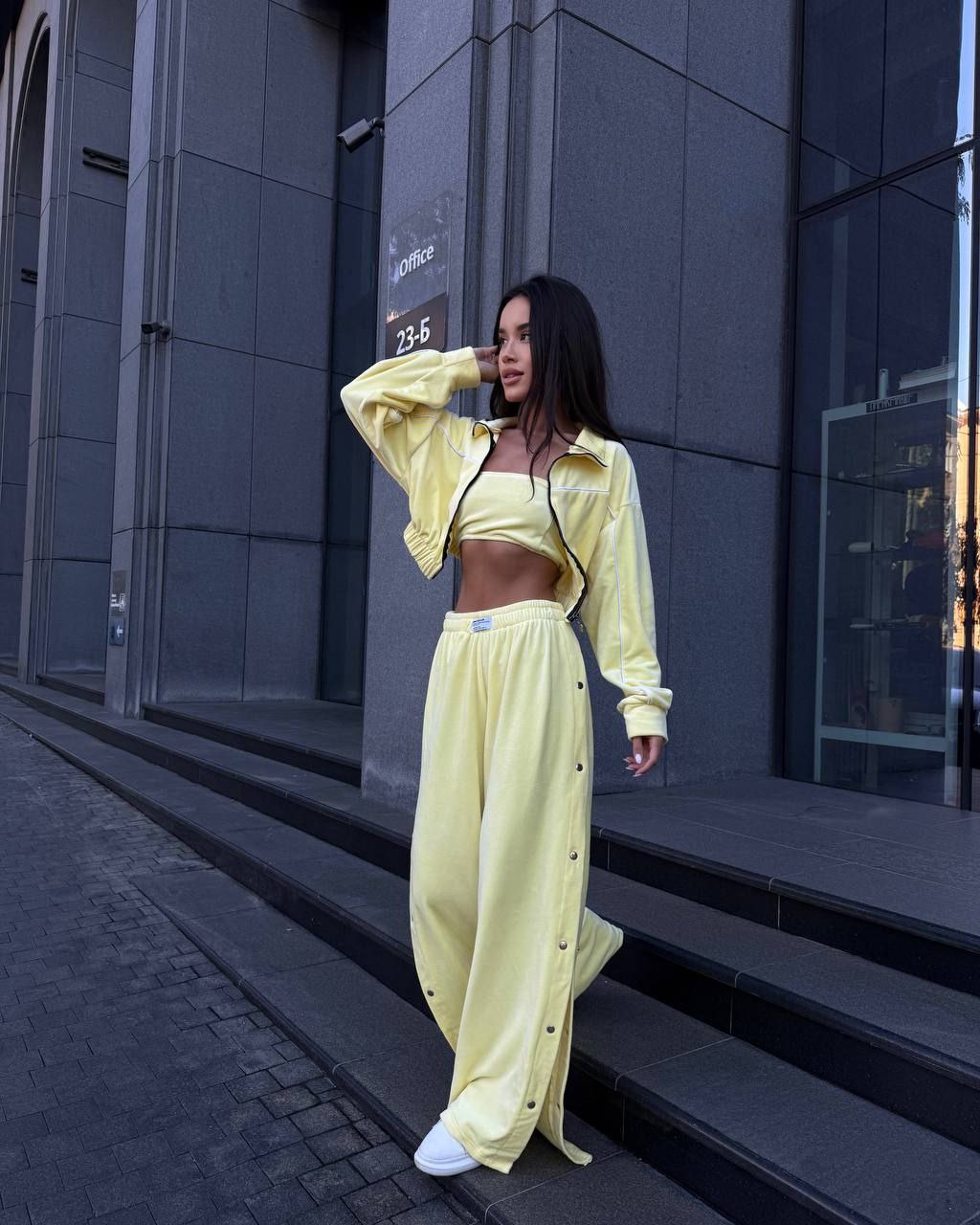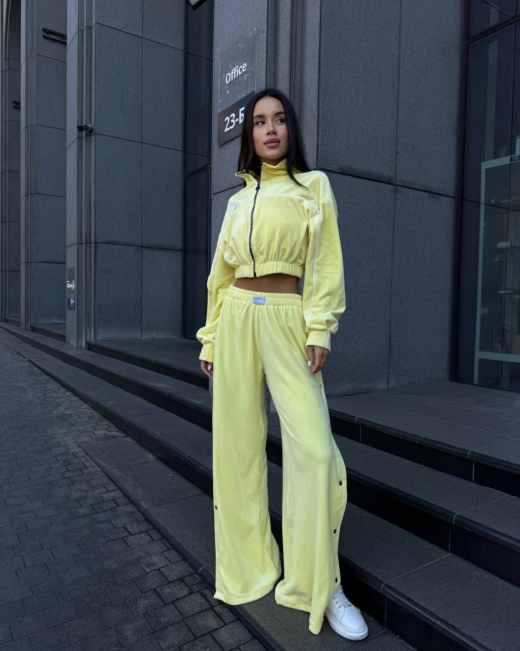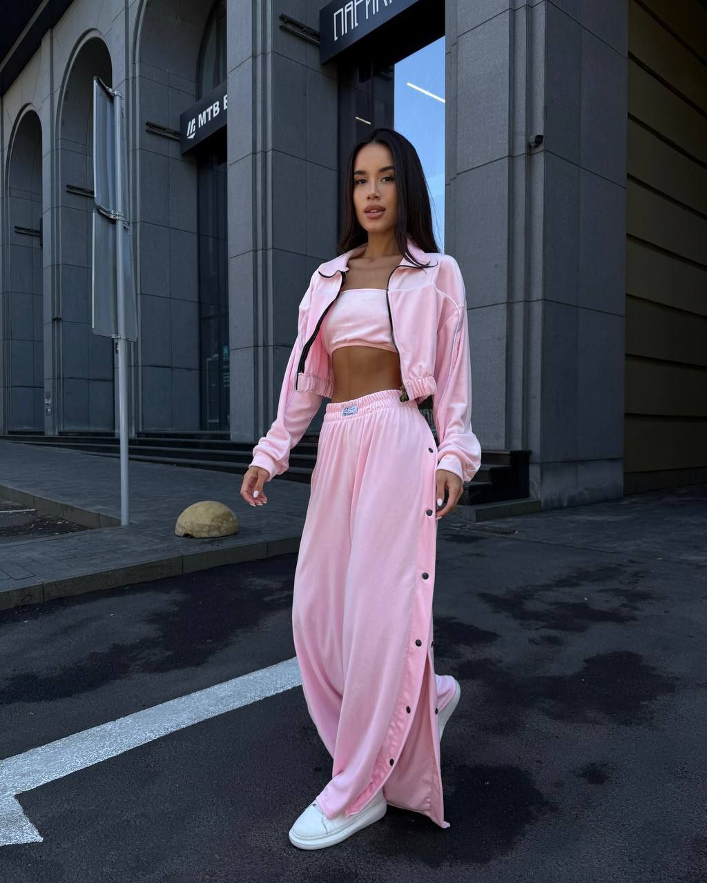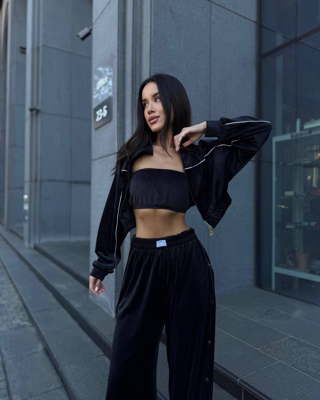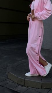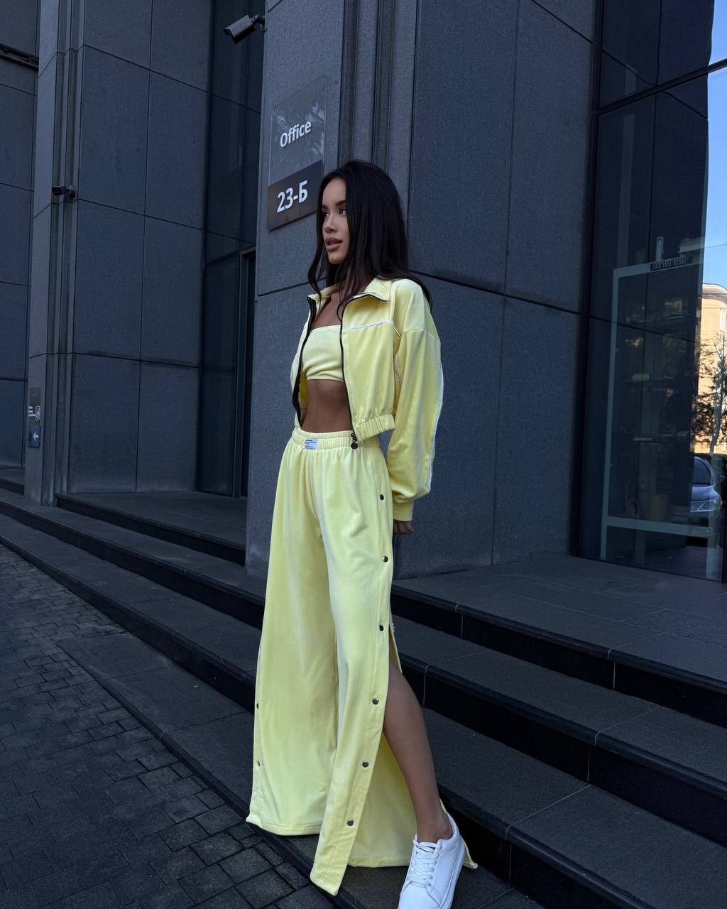 Ідеальний костюм з приємного мʼякого велюру. Складається з кофти, топу бандо та штанів на закльопках по боках. Кофта йде вкорочена на змійці, з кантом. Топ на резинці.