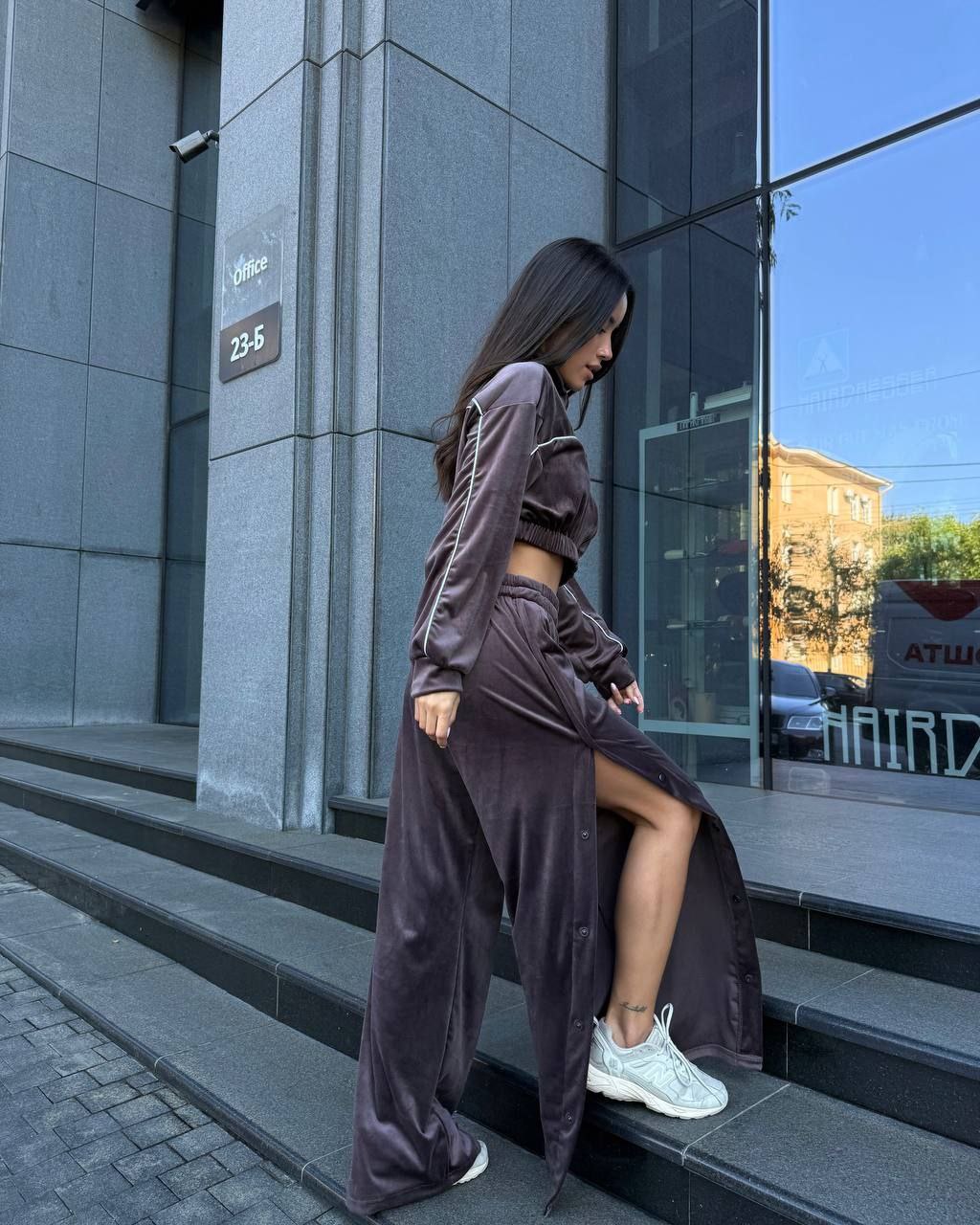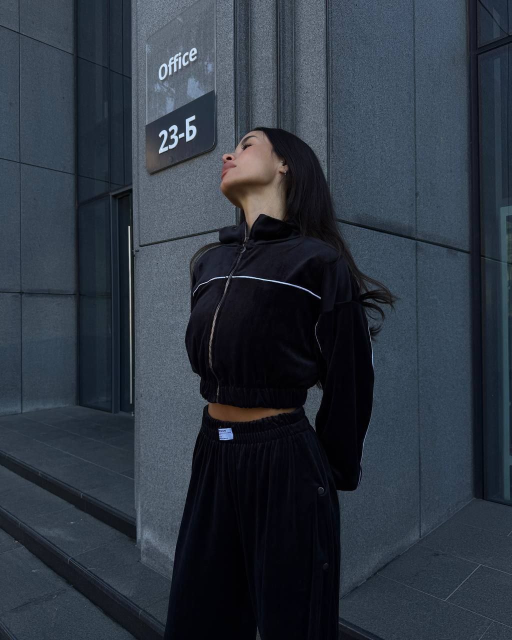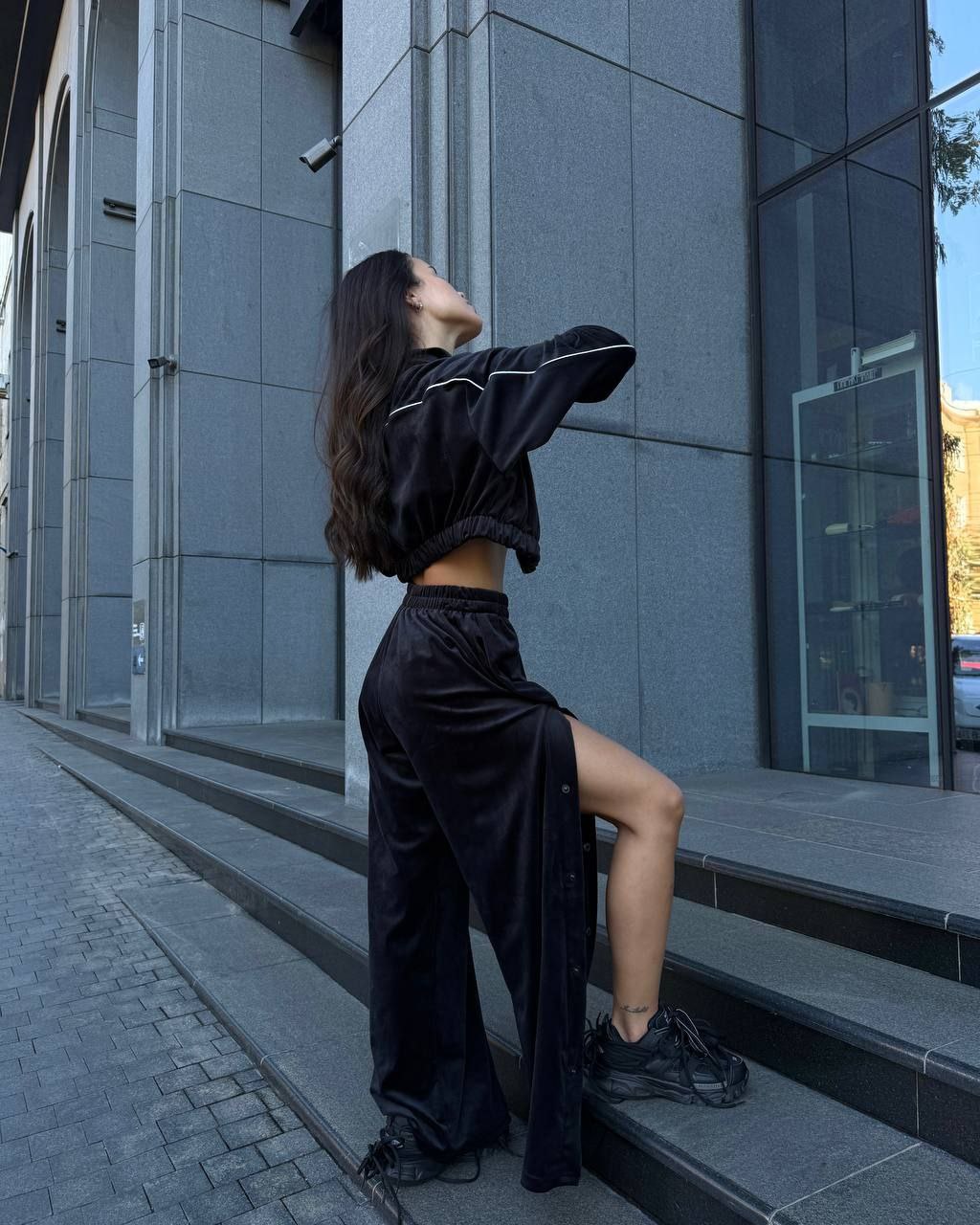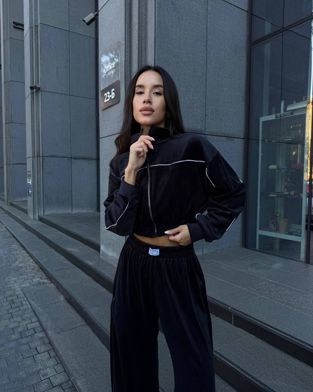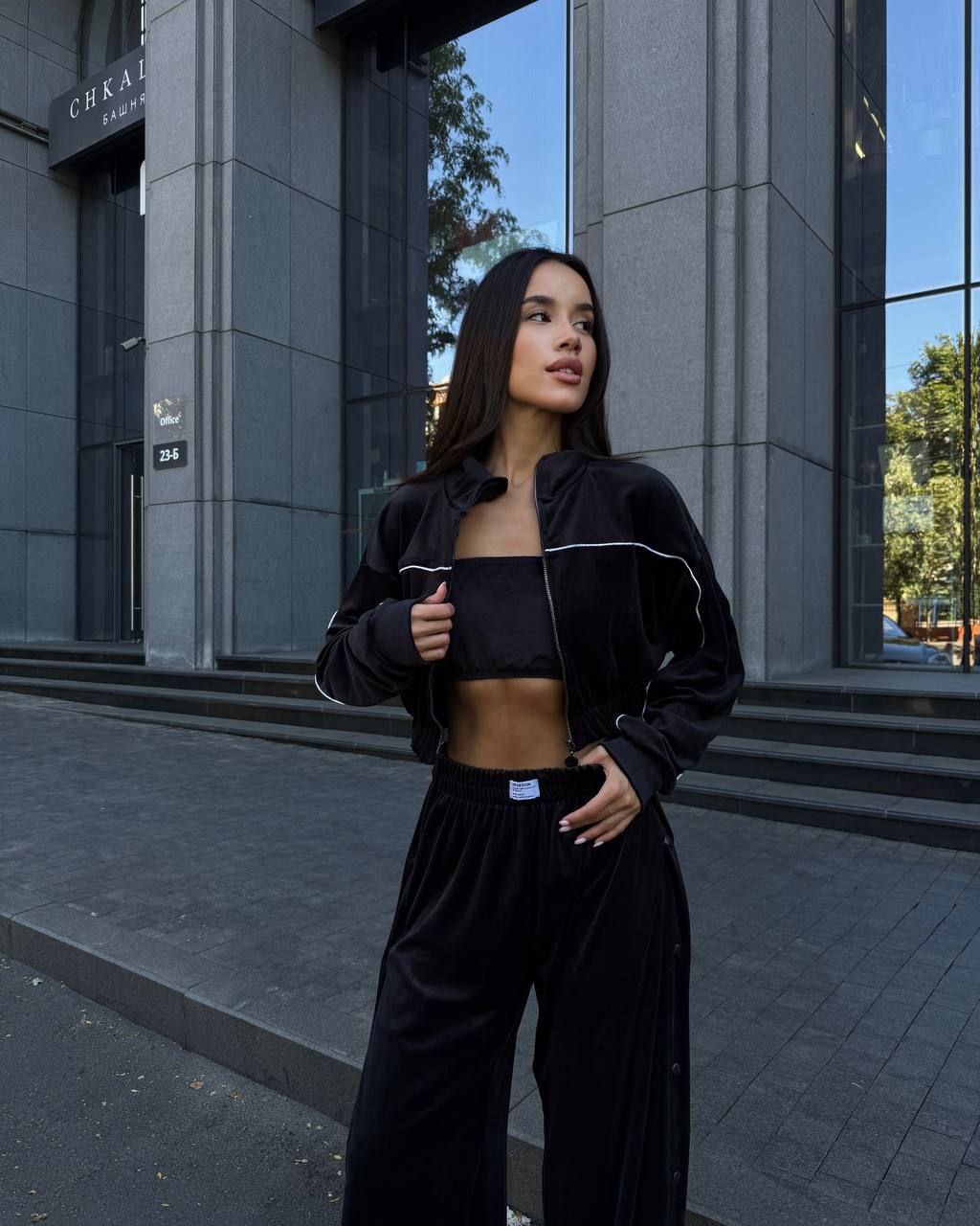 Ідеальний костюм з приємного мʼякого велюру. Складається з кофти, топу бандо та штанів на закльопках по боках. Кофта йде вкорочена на змійці, з кантом. Топ на резинці.