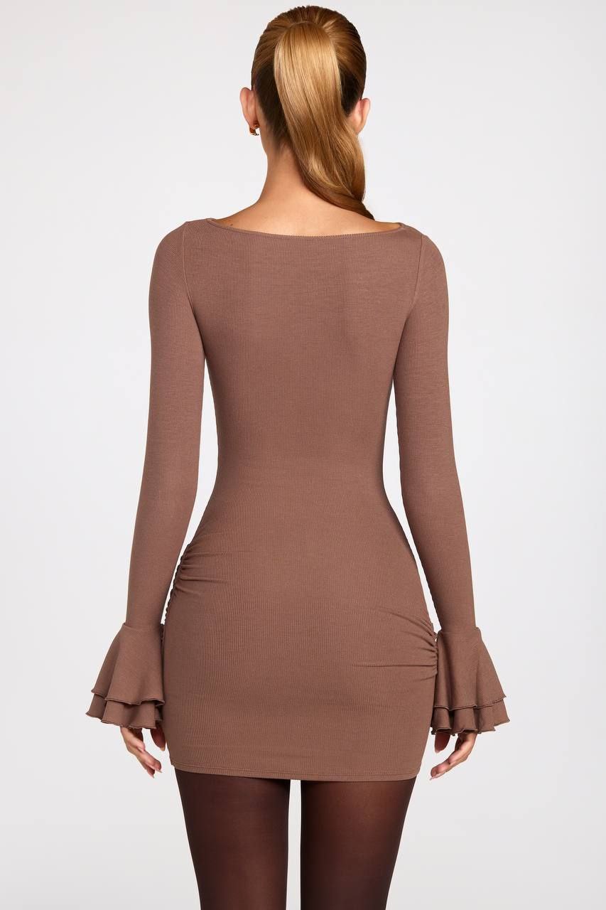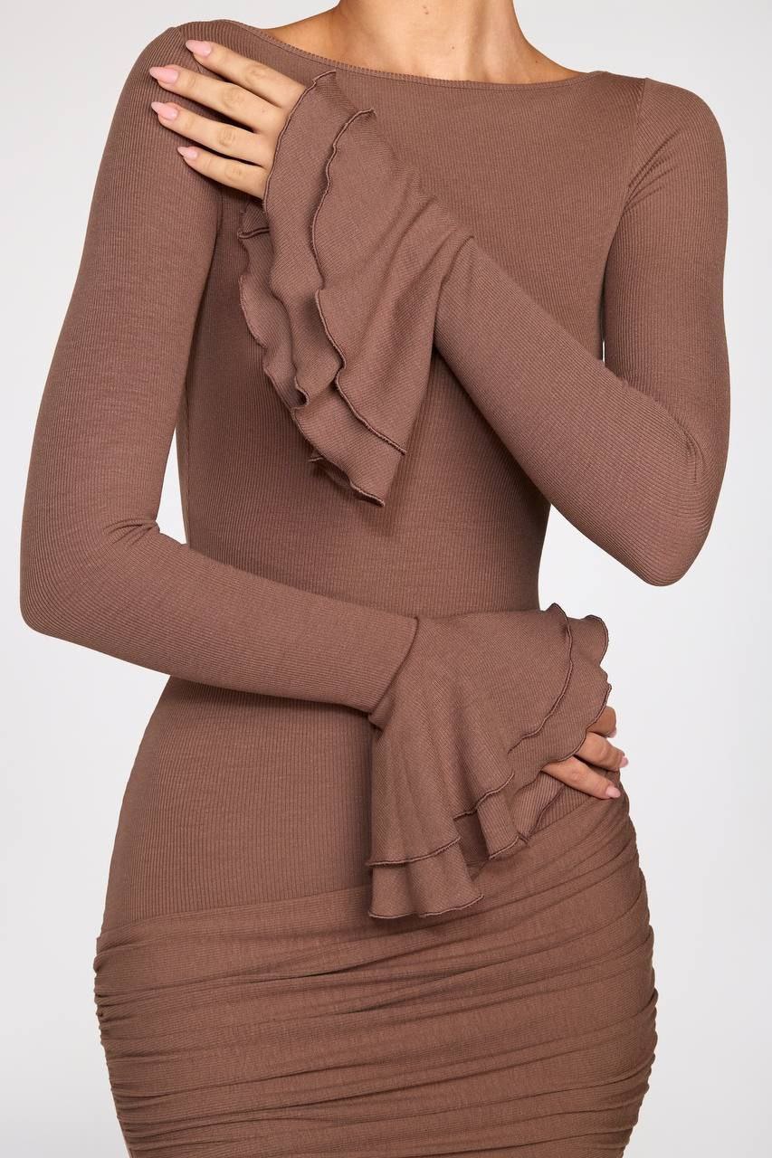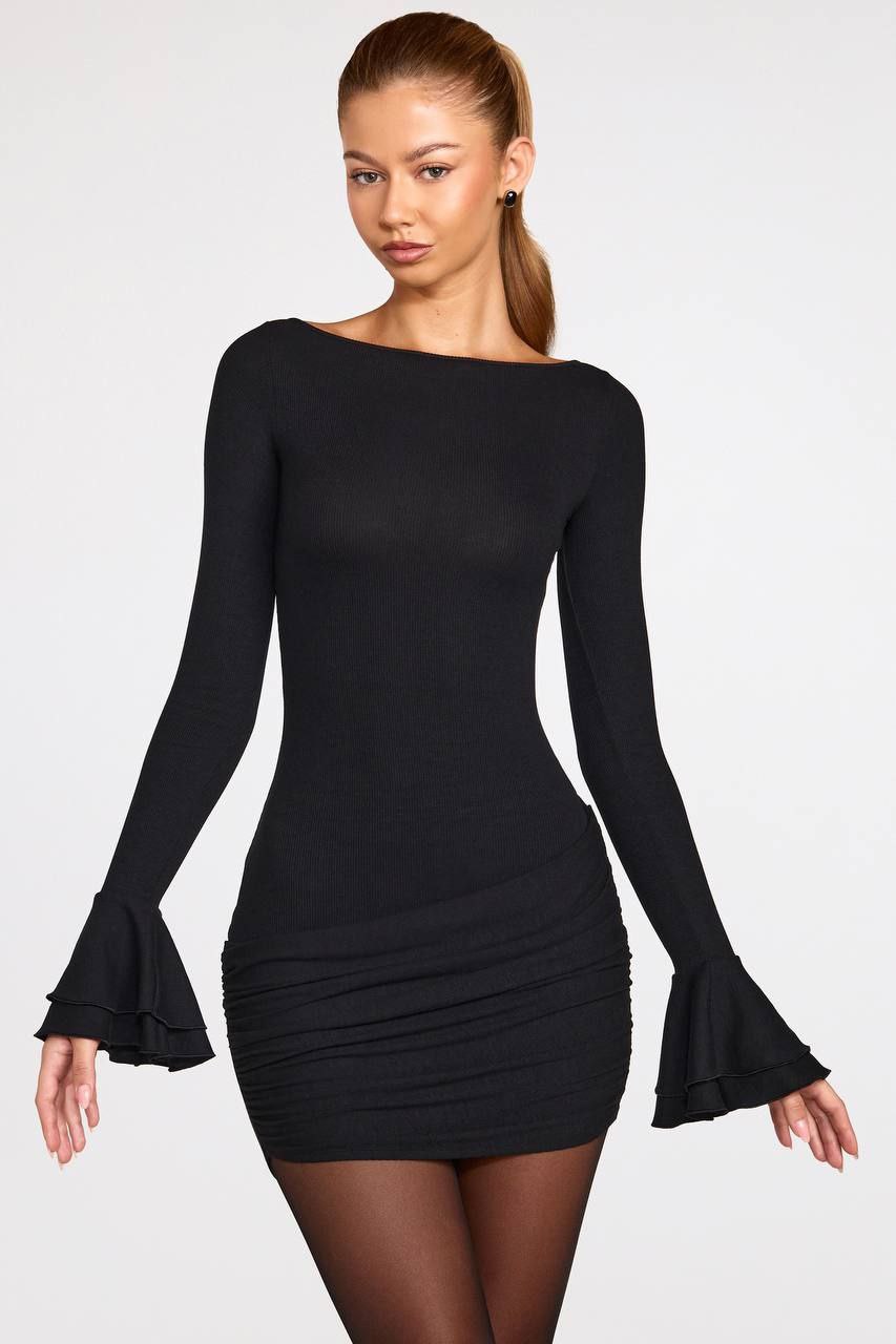 Вишукана міні сукня з акцентними воланами на рукавах, що надають образу легкості та шарму. Тканина мʼяка та приємна до тіла, ідеально сідає по фігурі завдяки стрейчевій тканині, по бокам є драпірування.