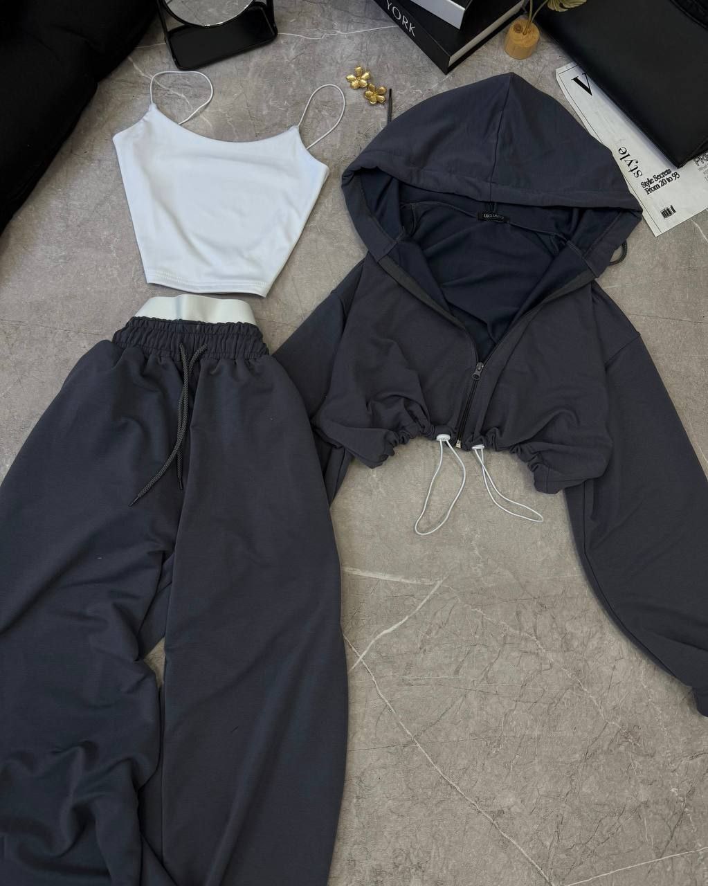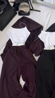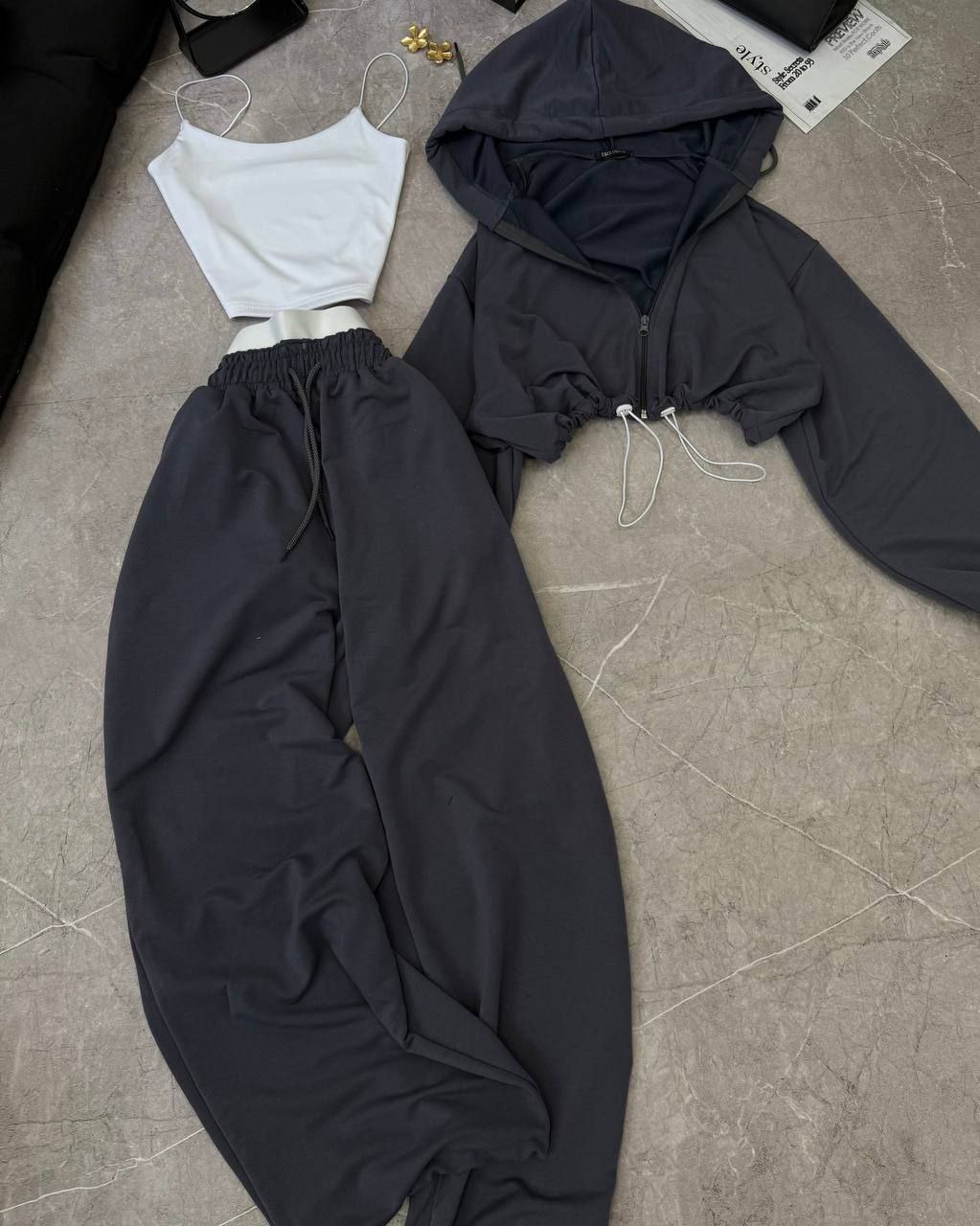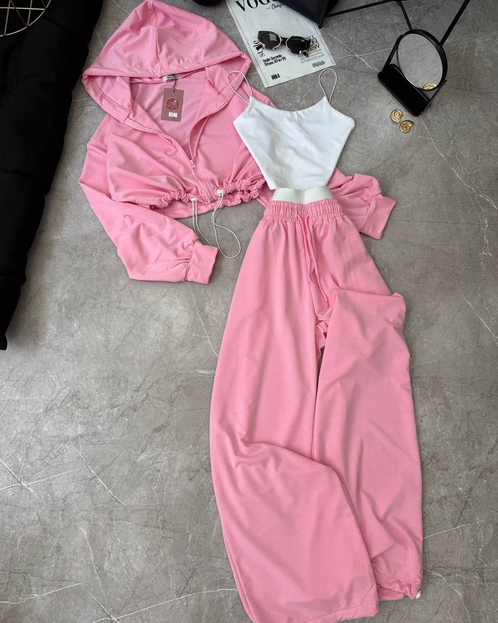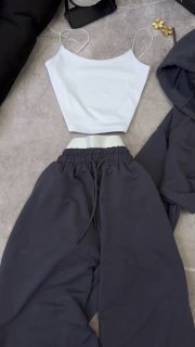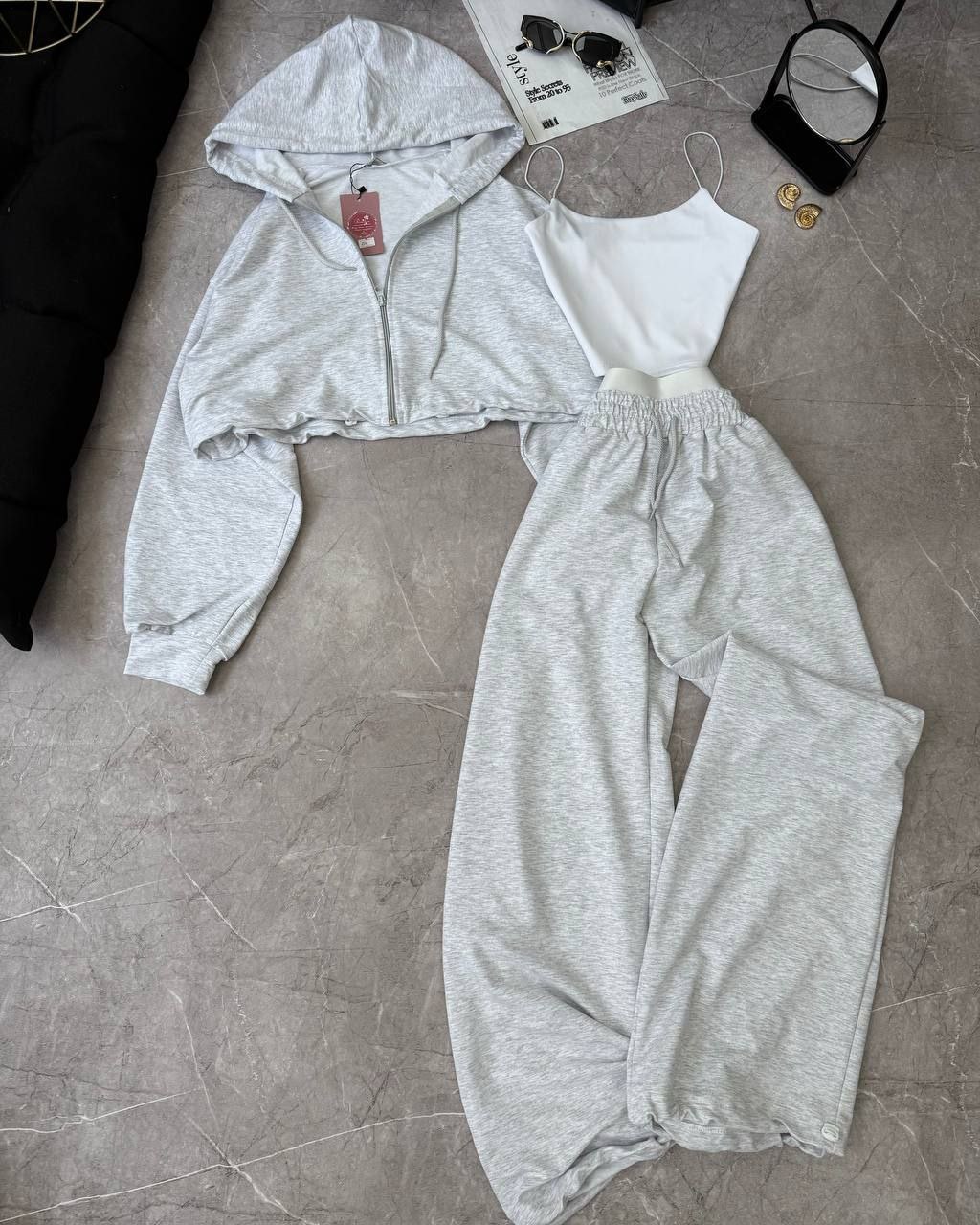 Спортивний прогулянковий костюм - трійка у стилі оверсайз, з вкороченої кофти, топу та обʼємними штанами. Приємна мʼяка тканина, не кошлатиться. Топ тягнеться та сідає по фігурі. Кофта та штани мають знизу фіксатори для зручності. Штани йдуть з резинкою, як на фото, та шнурками.